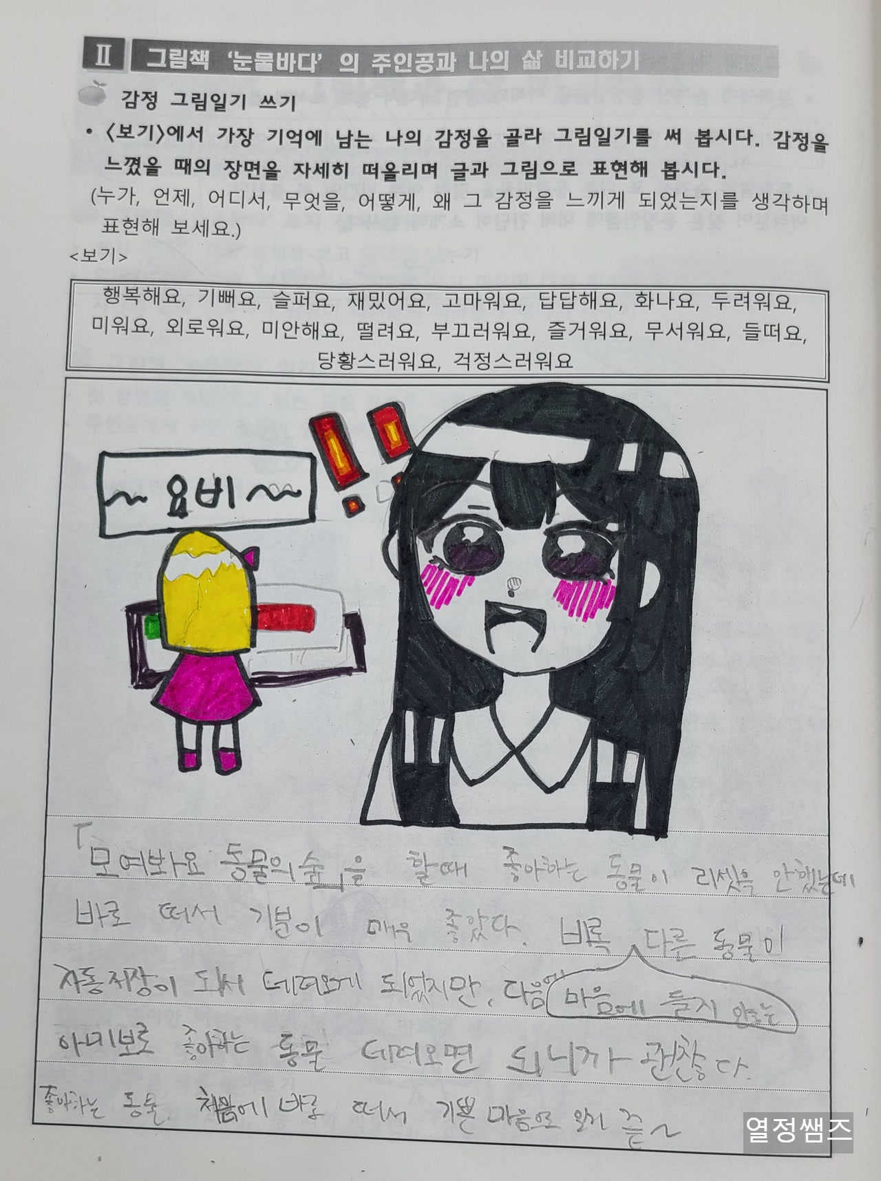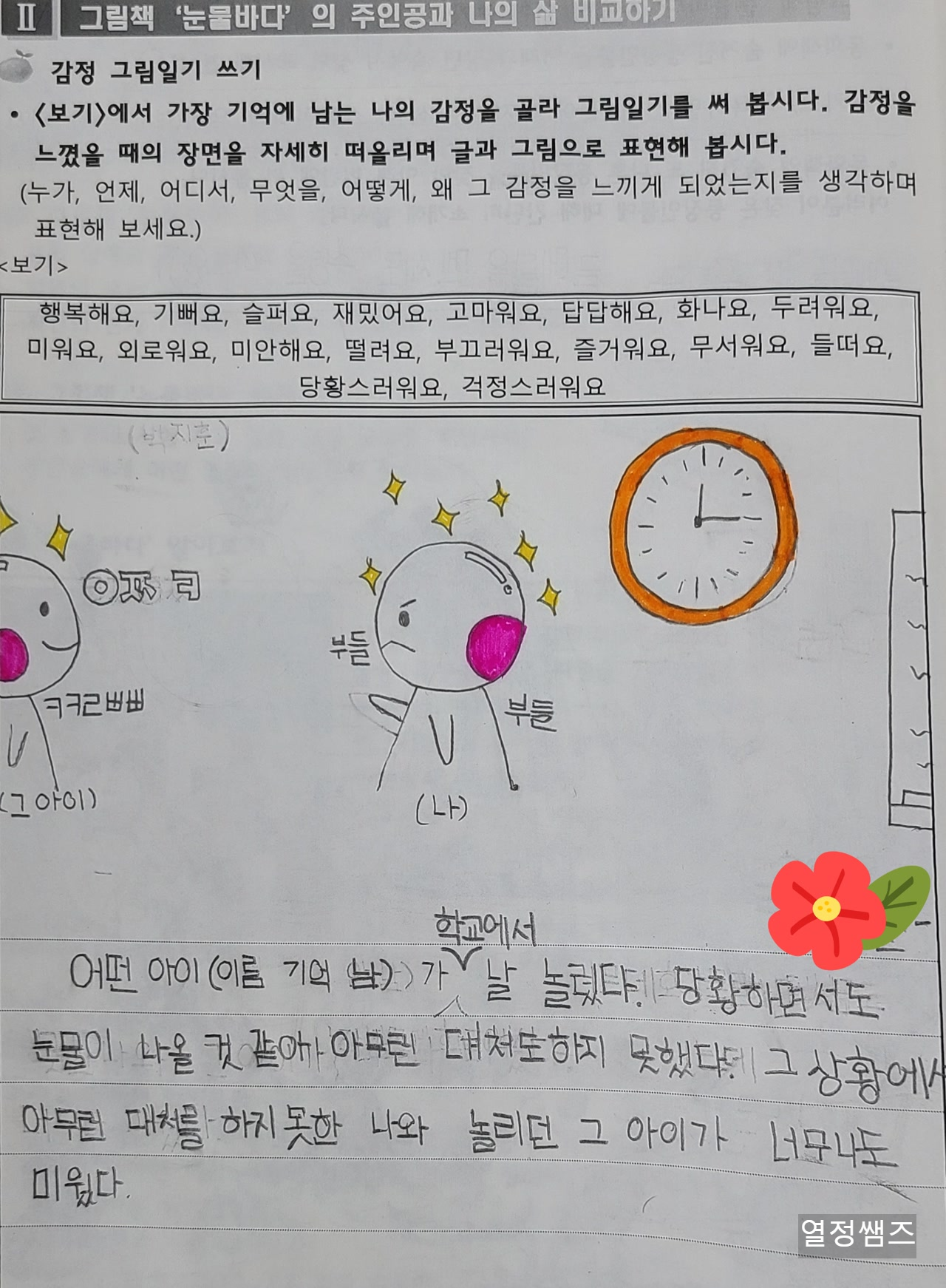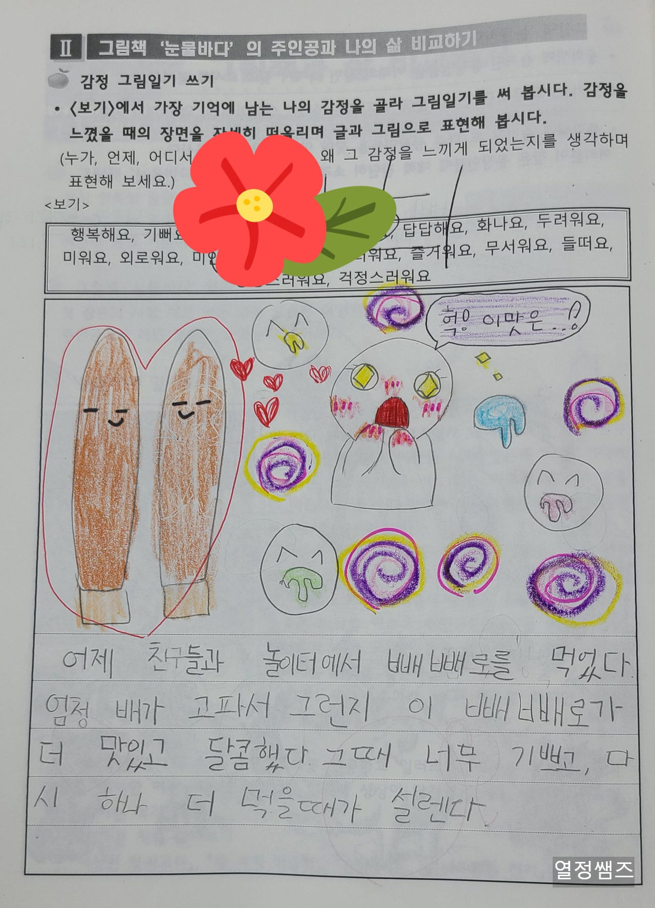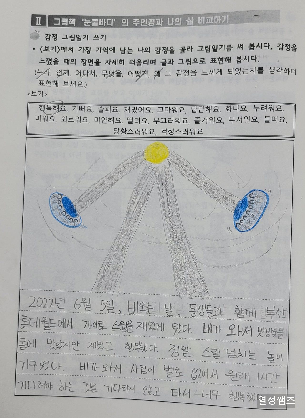 2022년 5월 문학영재수업, 서현 그림책 눈물바다를 읽고 감정 그림일기 쓰기를 했습니다.