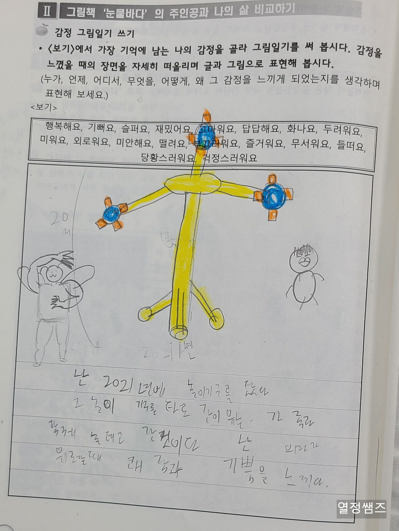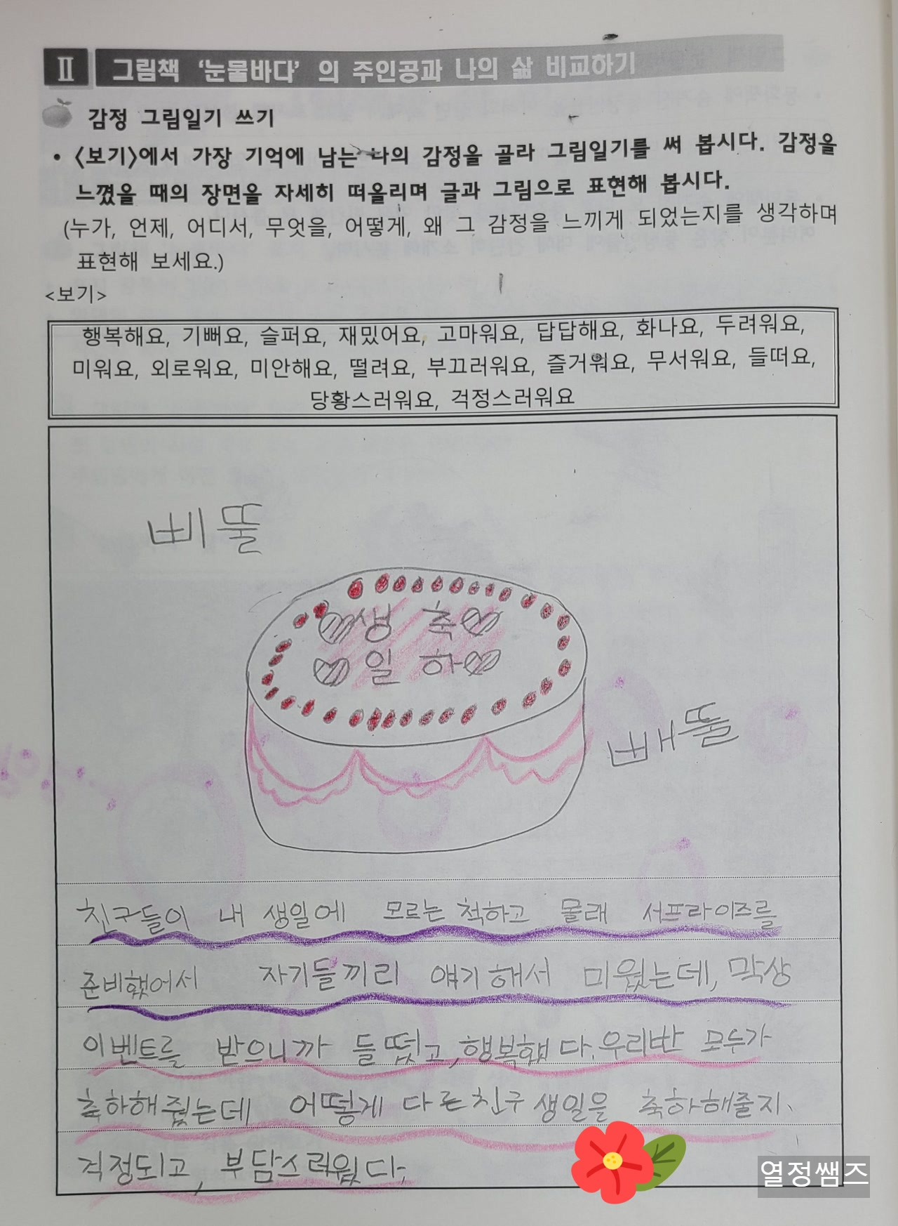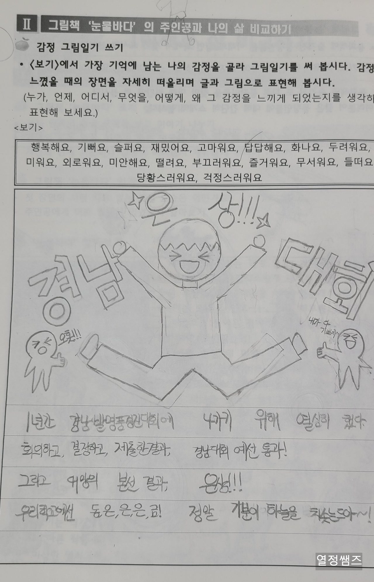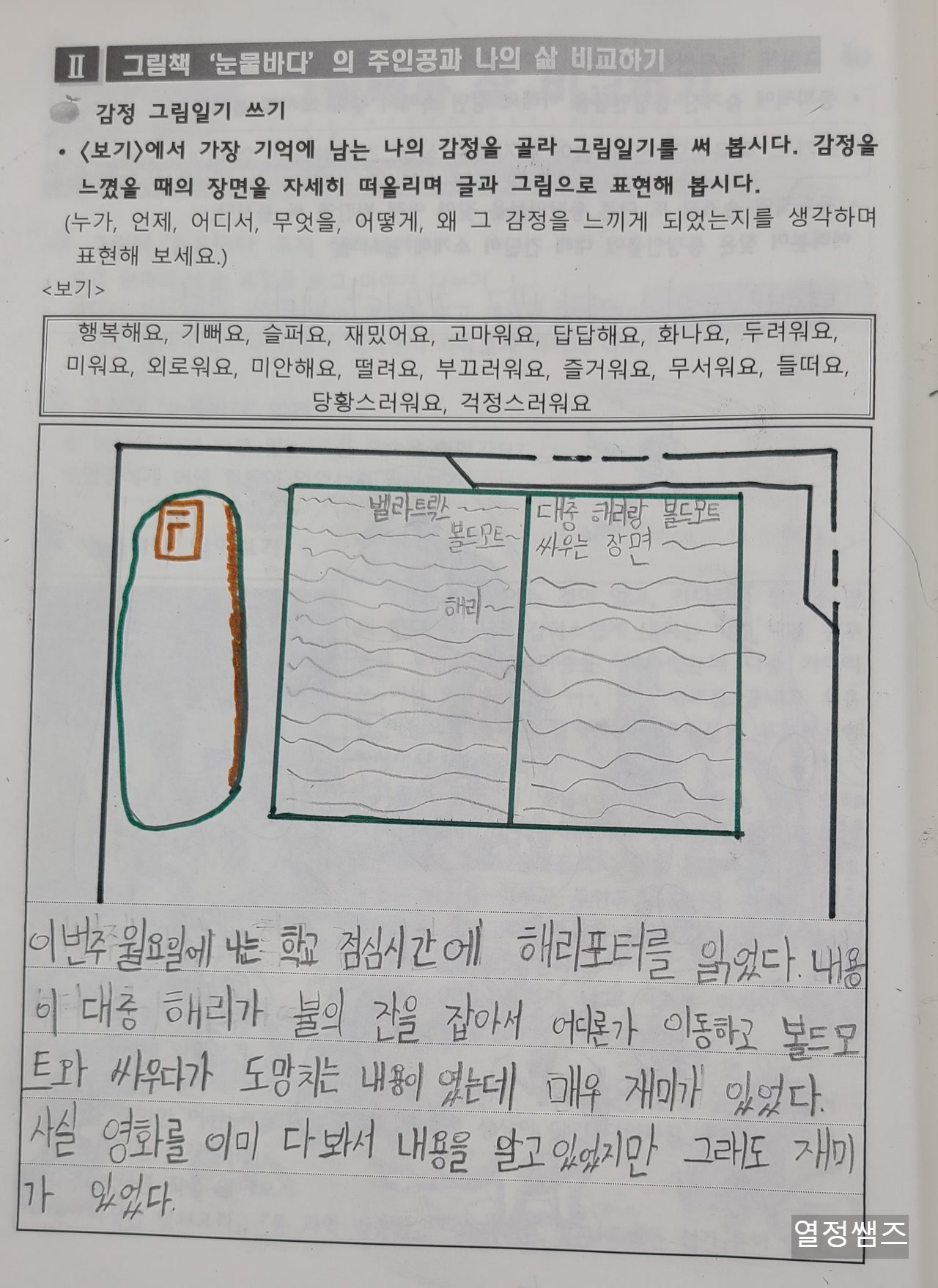 2022년 5월 문학영재수업, 서현 그림책 눈물바다를 읽고 감정 그림일기 쓰기를 했습니다.