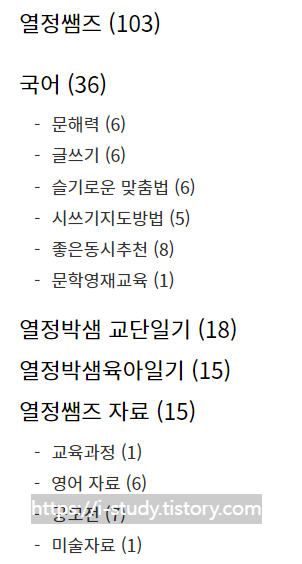 그 중에서 국어자료가 36개, 교단일기/육아일기가 33개, 기타자료가 15개, 취미 13개, 반려묘 4개입니다.