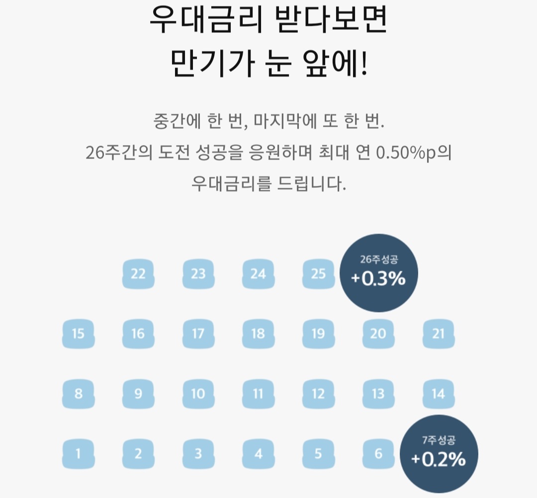현재 기본금리가 3.20%이고 7주 성공 시 0.2% 금리를 더 주고 26주 성공 시에 0.3%로 총 0.5%의 금리를 받을 수 있어서 3.7%의 금리를 받을 수 있습니다.