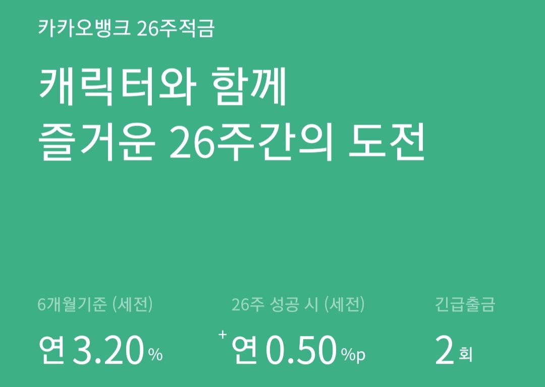 카카오뱅크 26주 적금은 캐릭터와 함께 즐거운 26주간을 도전하는 적금입니다.
