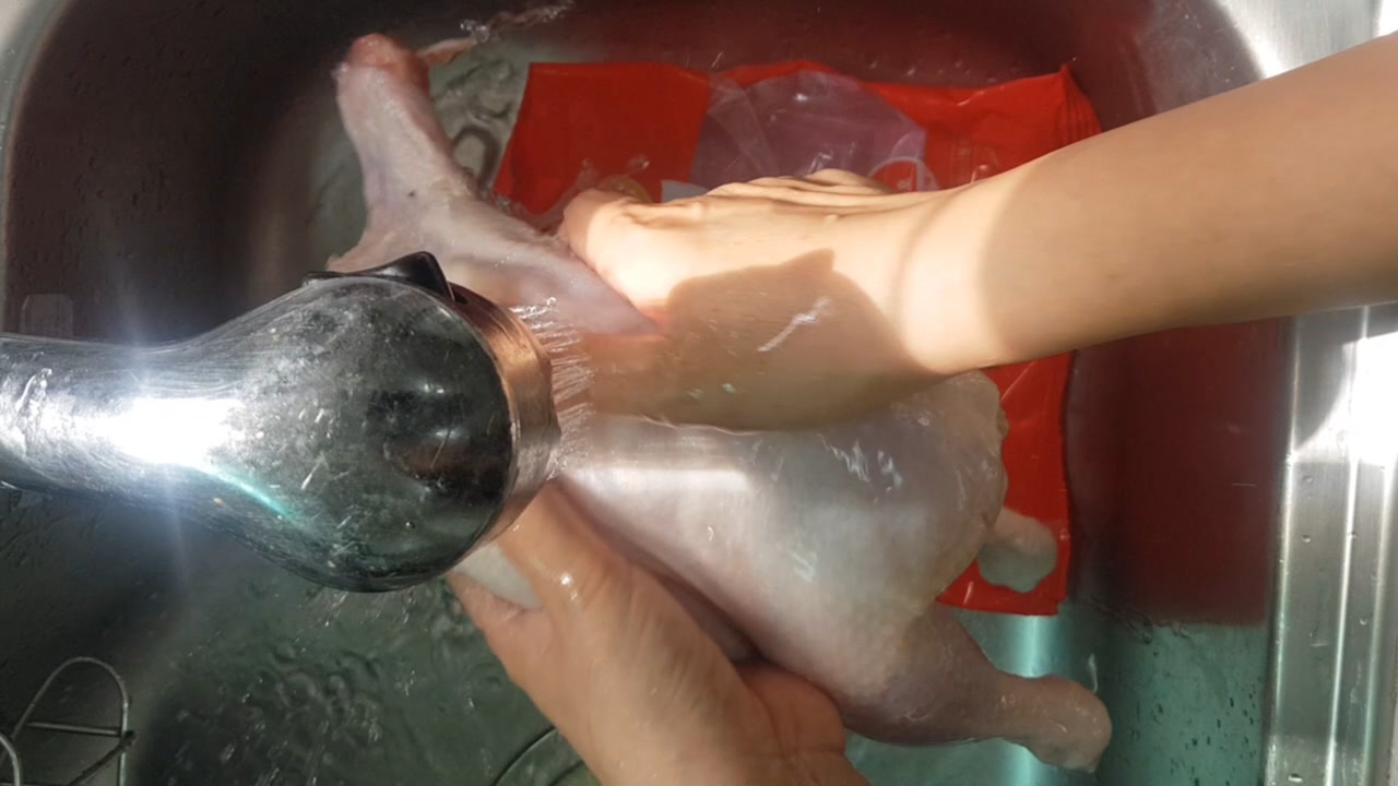 - 닭 뱃속을 깨끗하게 씻어줍니다. 안 떨어진 부분이 있다면 포크로 긁어내어 깨끗하게 해 줍니다. 닭냄새가 나지 않는 방법입니다.