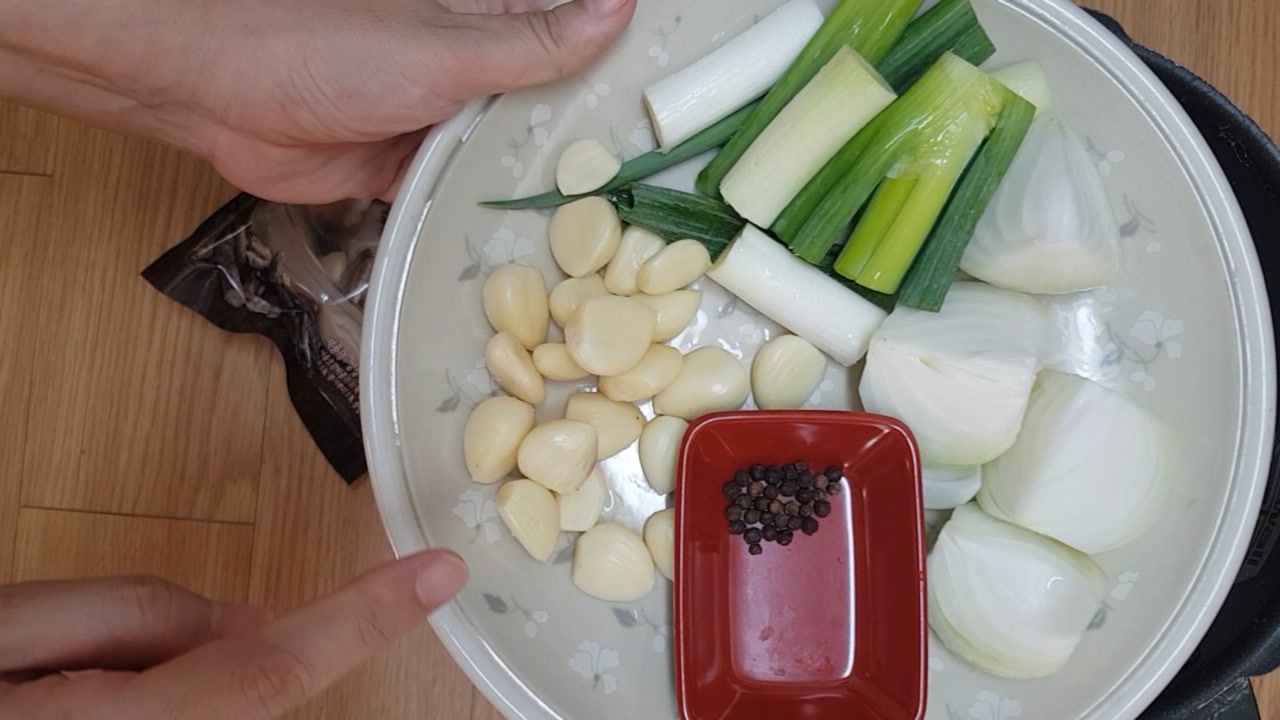 - 양파 1개, 대파 1개, 후추 10알, 깐마늘 20개를 준비합니다.