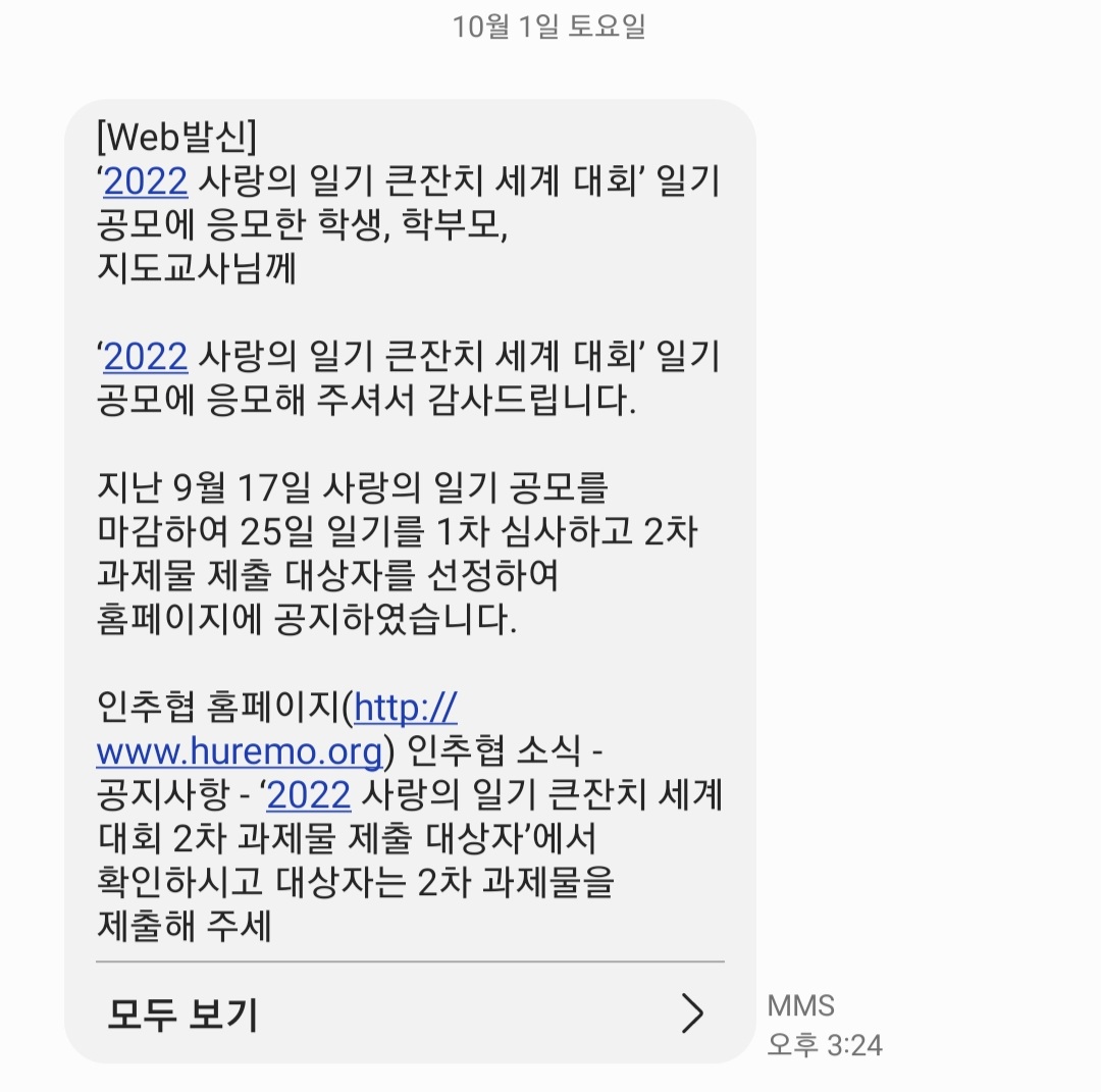인추협 홈페이지를 열어보고 2차 과제물이 선정된 아이에게 연락을 합니다.