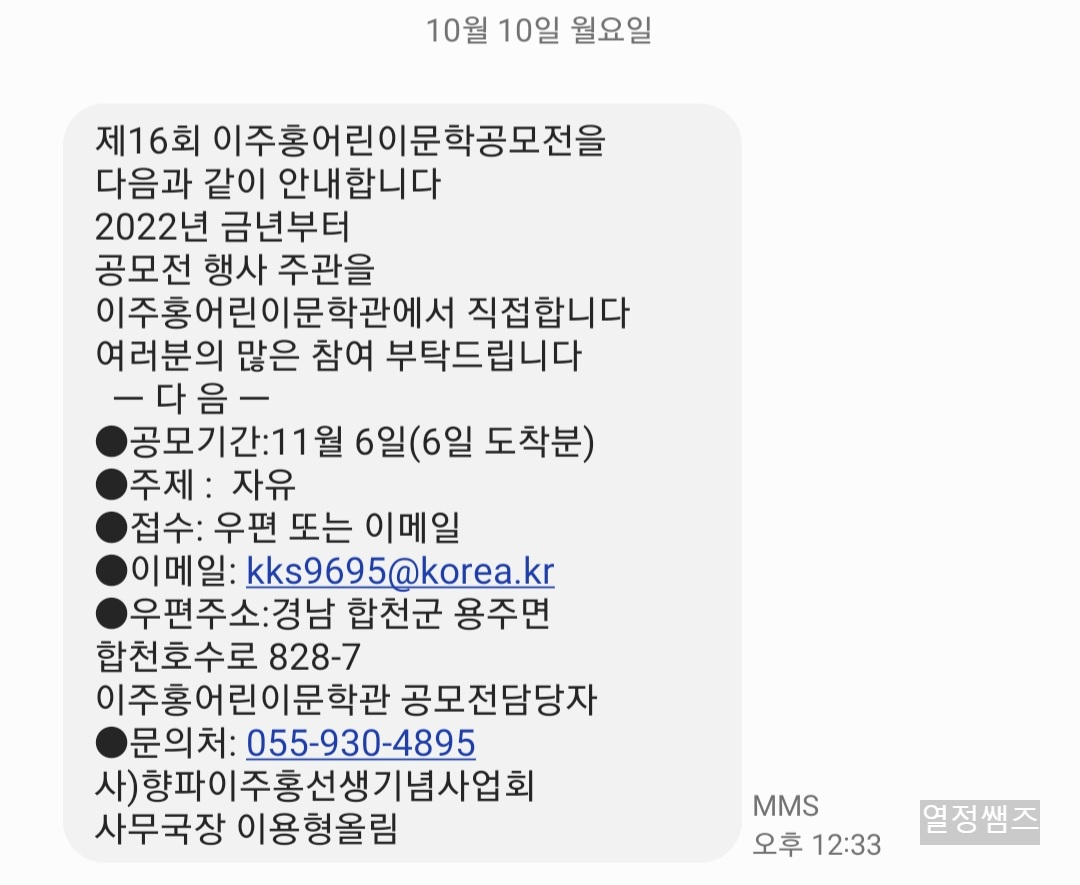 제16회 이주홍어린이문학공모전을 한다는 내용이었습니다. 예전 부림초에 있을 때 대회에 응모했더니 매년 이렇게 문자가 옵니다.