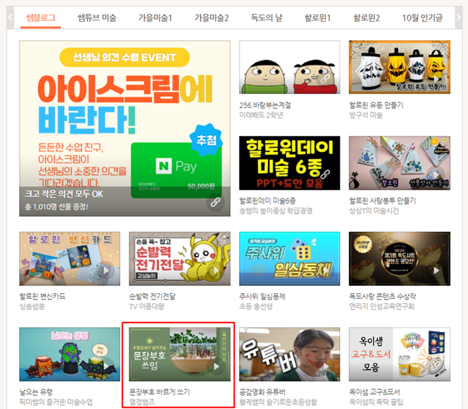 2022년 10월 초등아이스크림 쌤블로그 메인에 제 자료들입니다.