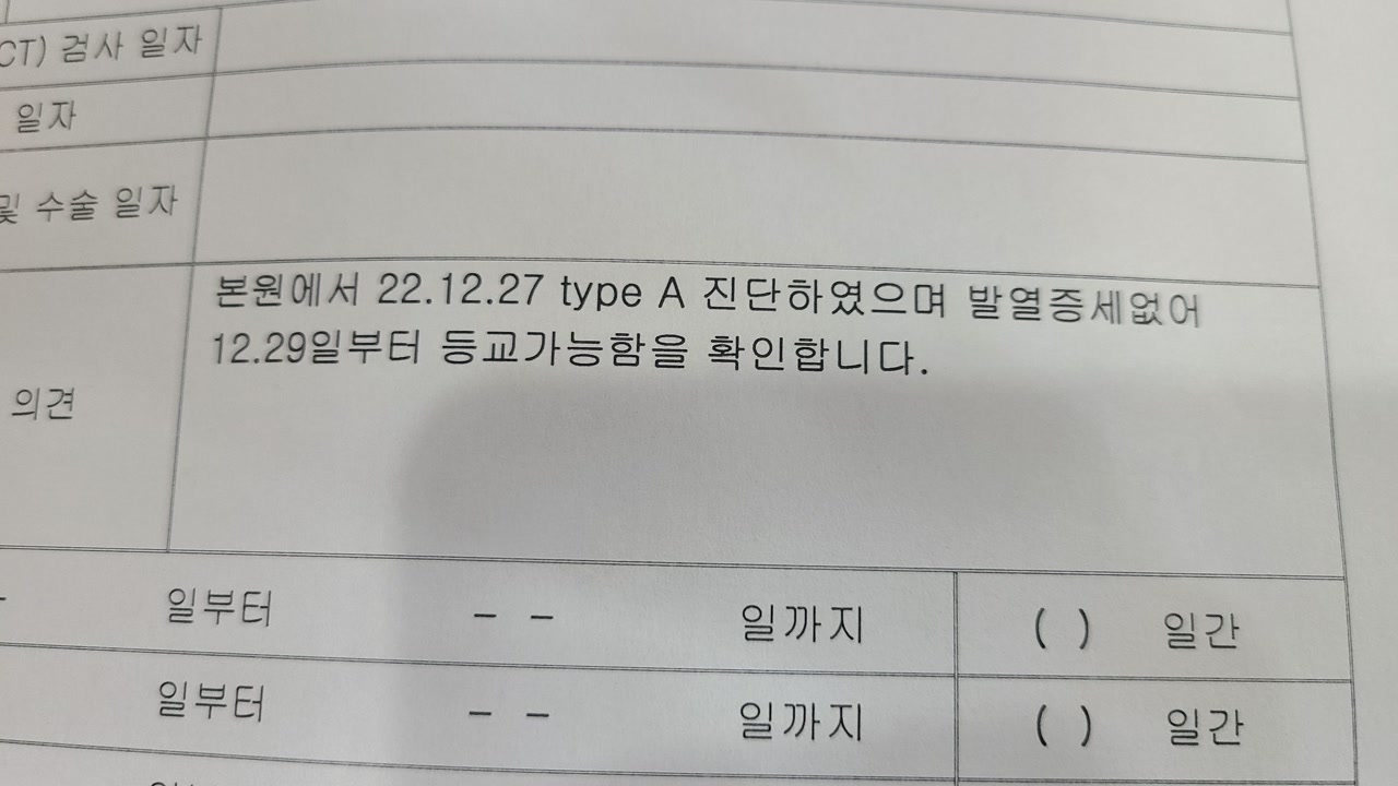 A형 독감의 경우 5일까지는 출석인정이 됩니다. 진료확인서를 학교 담임선생님께 제출하면 됩니다.