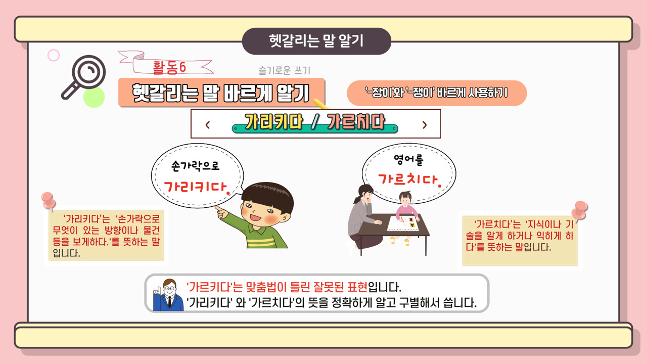 -'가리키다'와 '가르치다'의 뜻을 정확하게 알고 구별해서 씁니다.