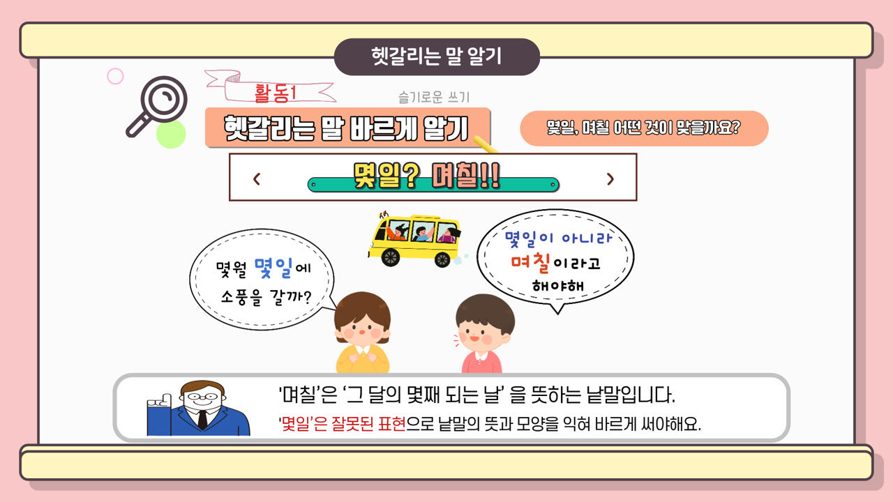 '몇일'은 잘못된 표현으로 낱말의 뜻과 모양을 익혀 바르게 써야해요.