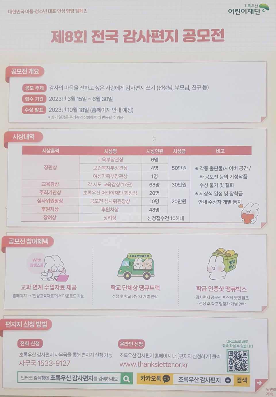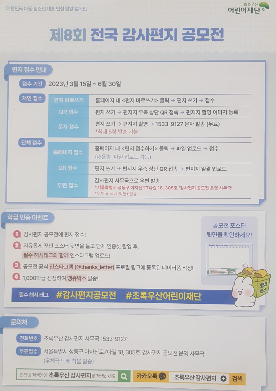 다. 학급 인증샷 땡큐박스: 감사편지 공모전 포스터 뒷면 참조, 선정 후 학교 담당자 개별 연락