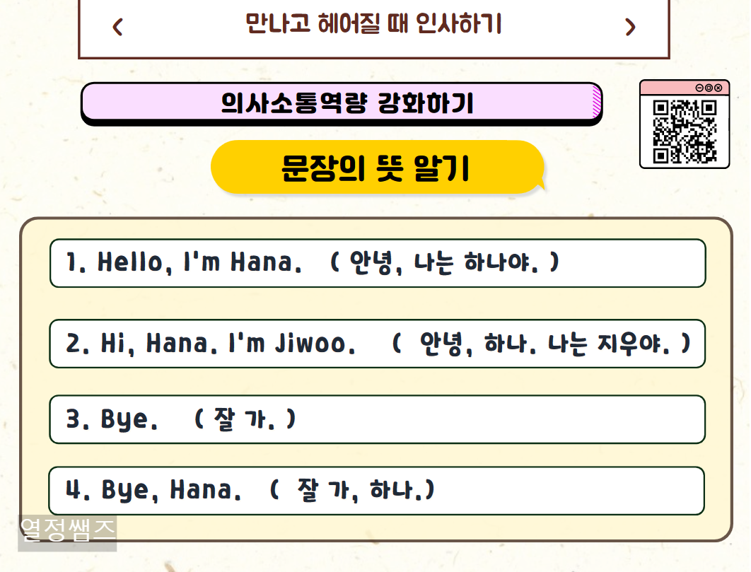 B: Hi, Hana. I'm Jiwoo (안녕? 하나. 나는 지우야.)