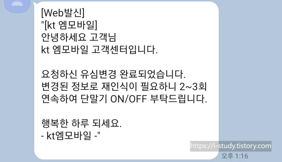 kt 엠모바일로부터 유심변경이 완료되었다는 카카오톡이 남편에게 왔습니다.