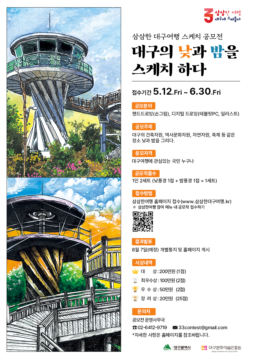 대구의 3대문화권 관광자원을 매력적이고 독창적으로 표현한 스케치 작품을 통해 대구의 3대 문화 관광자원을 알리고 대구의 새로운 여행의 매력을 널리 홍보하기 위한 '삼삼한 대구여행 스케치 공모전'을 다음과 같이 개최하오니 많은 참여 바랍니다.