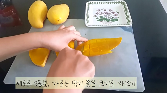 - 망고의 껍질이 잘리지 않게 망고 껍질 앞까지 선을 그어준다는 생각으로 세로로 3번 칼질을 해주고, 가로로 큐브 모양이 되게 칼질을 해 주었어요.