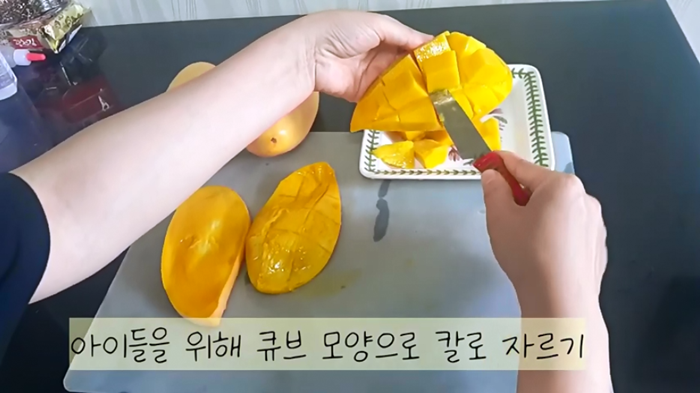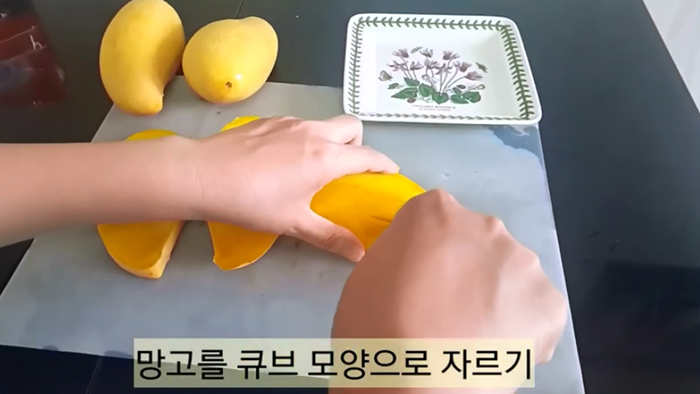 망고를 큐브 모양으로 자르려고 해요. 큐브 모양으로 그대로 전시를 해도 예쁜 것이 바로 망고가 아닐까 싶어요.