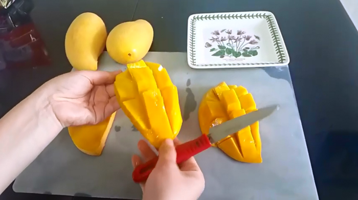 - 선을 그어준 뒤에 망고의 끝을 잡고 밀어주면 예쁜 모양의 망고가 나오네요. 이 모양 그대로 접시에 담아서 포크로 떼어먹어도 괜찮답니다.