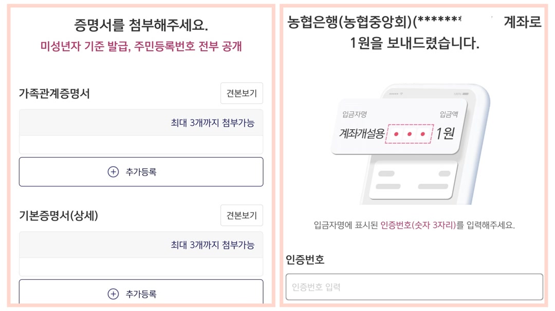 부모 계좌로 1원이 입금되면서 입금자명에 인증번호 숫자 3자리가 오면 입력을 하면 됩니다.