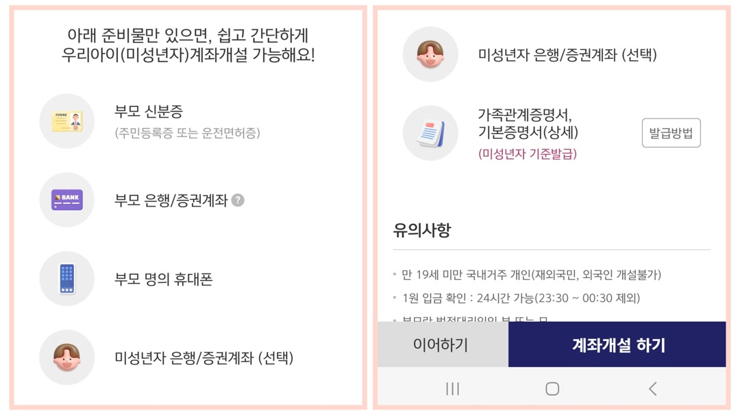 - 법정대리인인 부모의 신분증, 휴대전화, 은행 또는 증권계좌