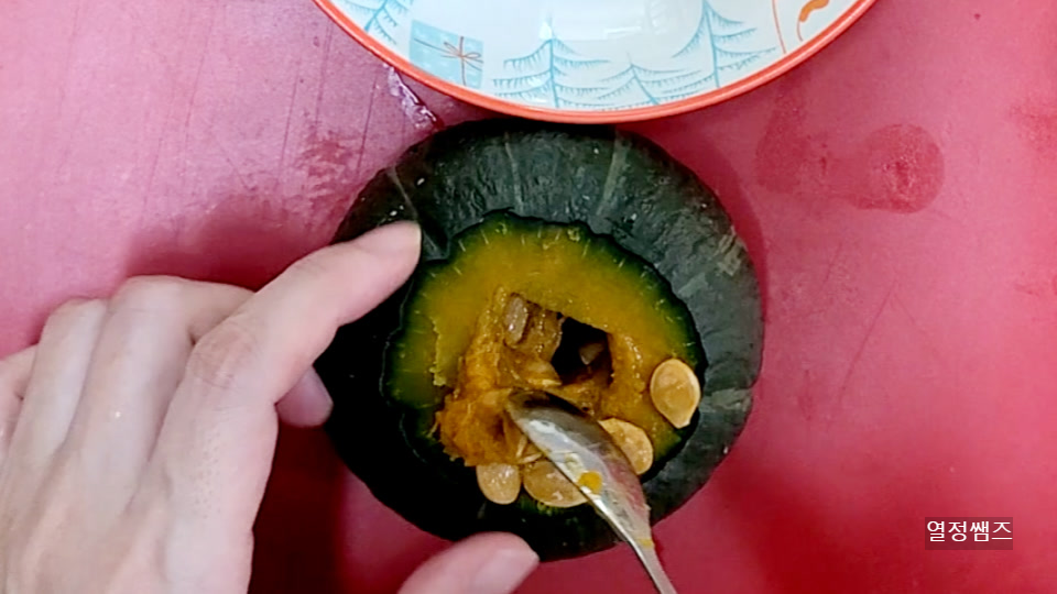 - 처음에는 숟가락으로 빼려고 했는데 단호박이 미니 단호박이다 보니 숟가락이 들어가지 않습니다. 그래서 티스푼을 이용하여 씨를 빼었습니다.
