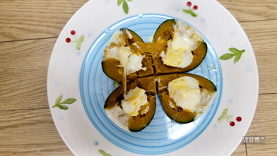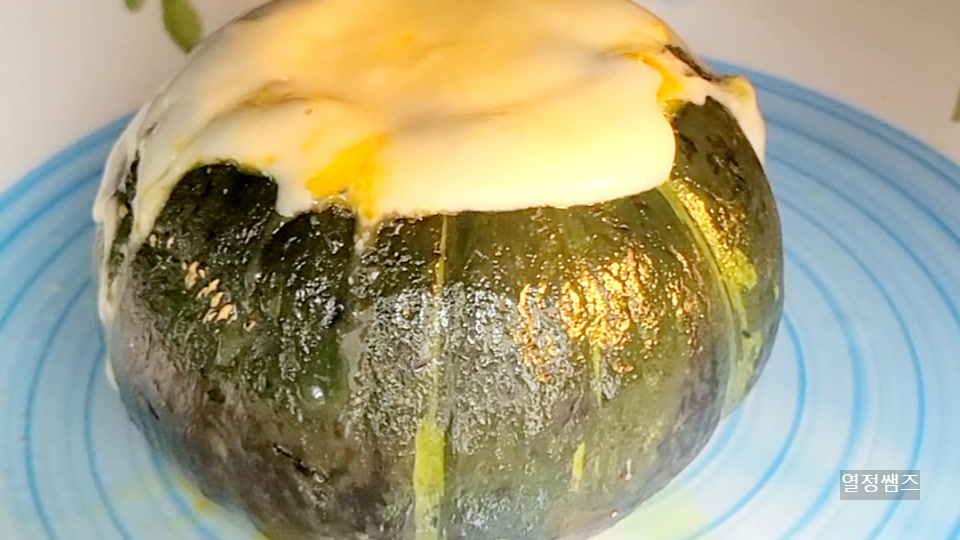 쭉쭉 늘어나는 치즈에 달걀과 단호박이 너무 잘 어울립니다.