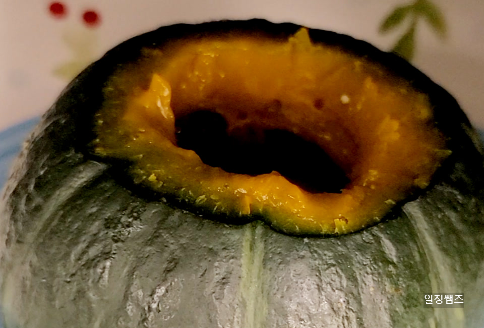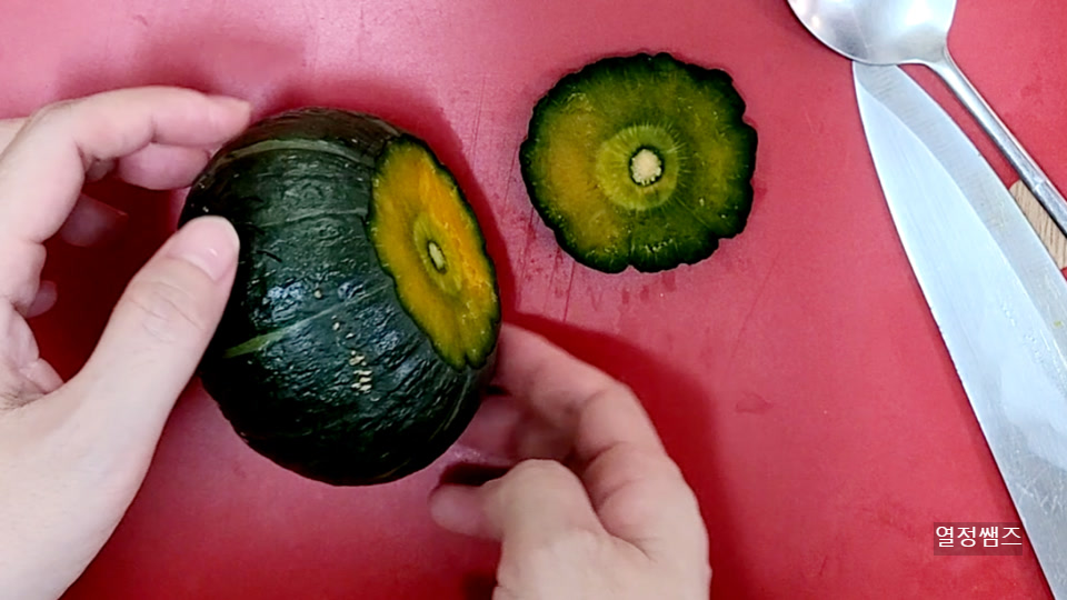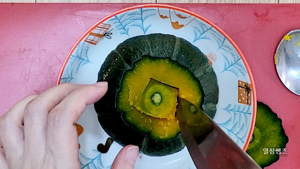 - 생단호박을 자르는 것보다 익힌 단호박을 자르는 것이 편합니다.
