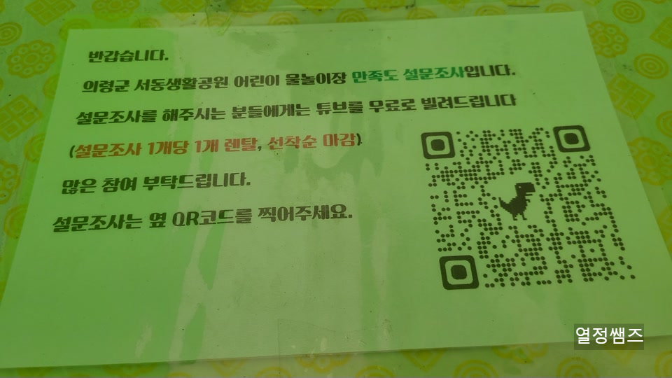 QR코드를 스캔한 후 물놀이장 만족도 설문 조사를 하면 수박 모양의 튜브 1개를 빌릴 수 있습니다.
