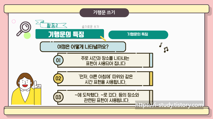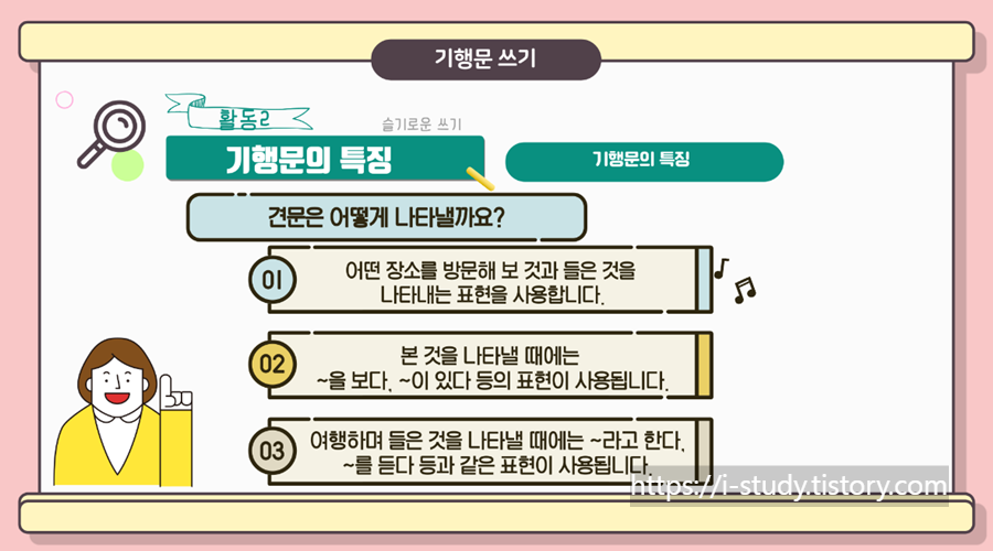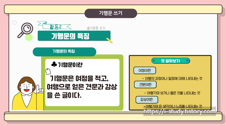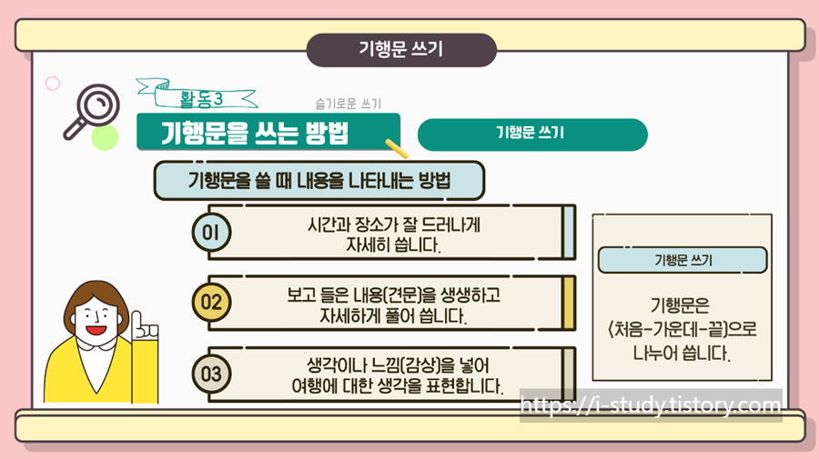 초등교사가 알려주는 기행문 특징과 기행문 쓰는 방법입니다. 기행문을 이해하고 기행문 쓰는 법을 알아봅시다. 초등학생들이 쉽게 이해할 수 있도록 영상을 제작하였습니다.