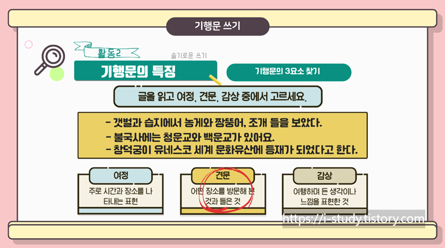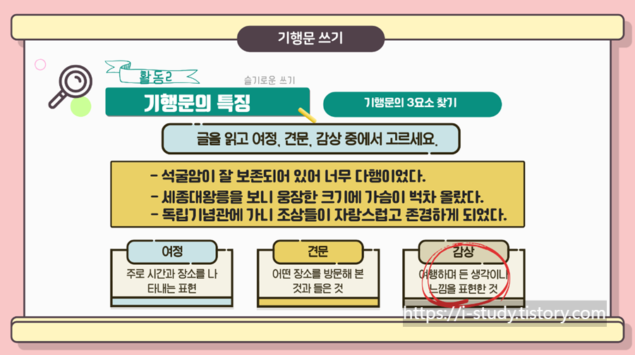 <기행문의 3요소 찾기: 여정, 견문, 감상>