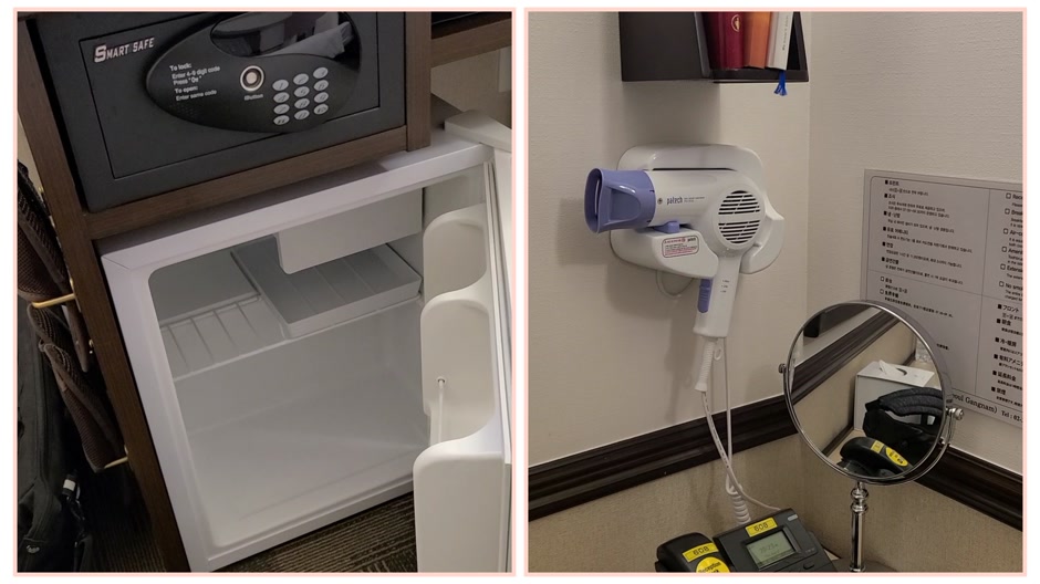 금고, 냉장고가 있습니다. 냉장고 성능이 좋아서 생수 2병을 잘 넣어두고 시원하게 먹었습니다. 경복궁에 가기 위해 양재역으로 16분간 걸어갈 때 매우 유용했습니다.