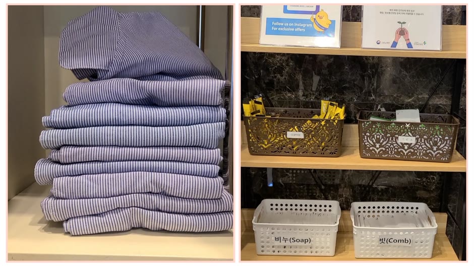 1층 엘리베이터 앞에 있는 원피스형 잠옷과 믹스커피, 차티백, 빗, 비누를 챙겨 올라왔습니다. 잠옷은 정말 편합니다. 짐도 줄여줍니다.