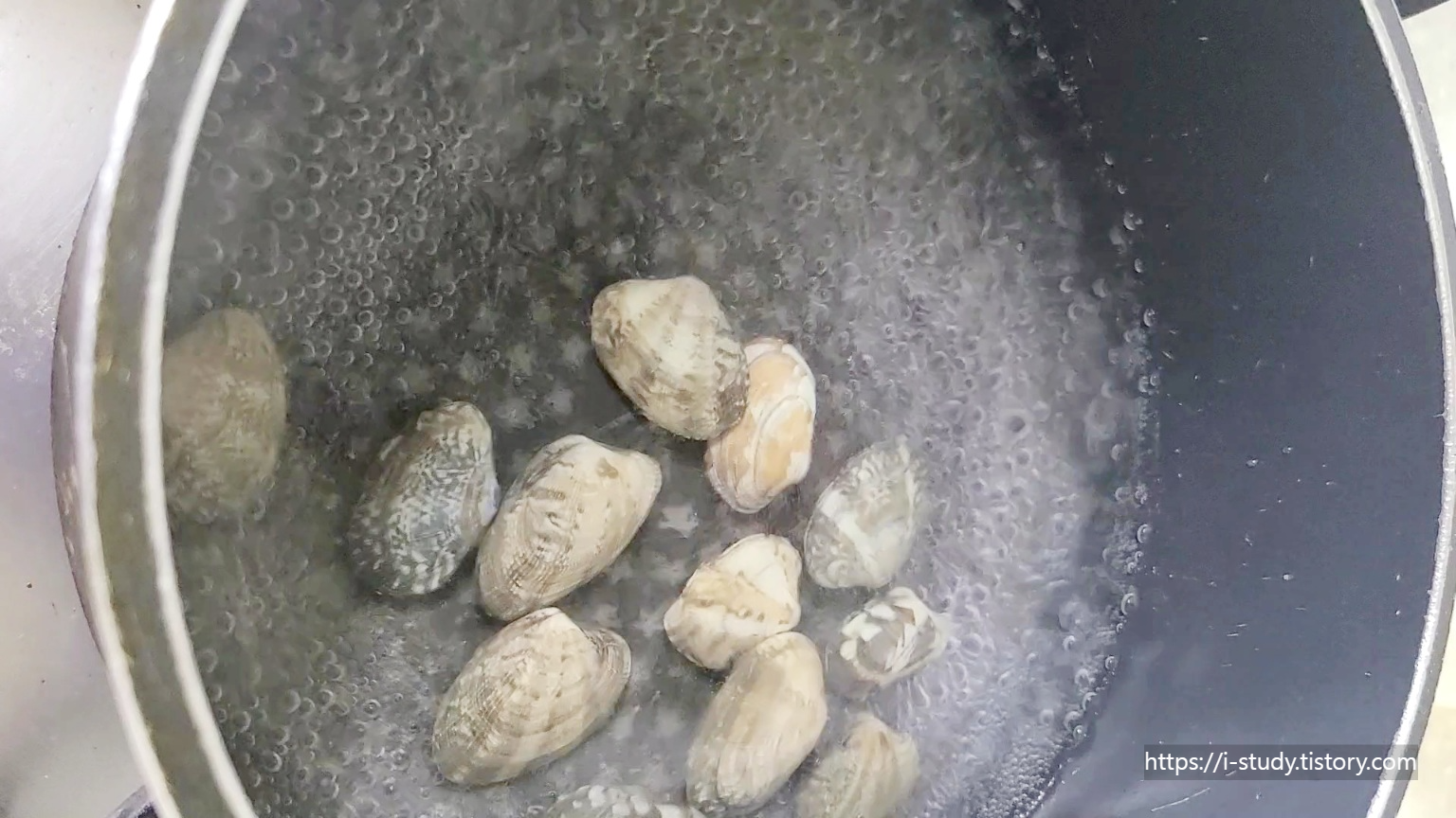 3. 끓는 물에 조개를 넣습니다.