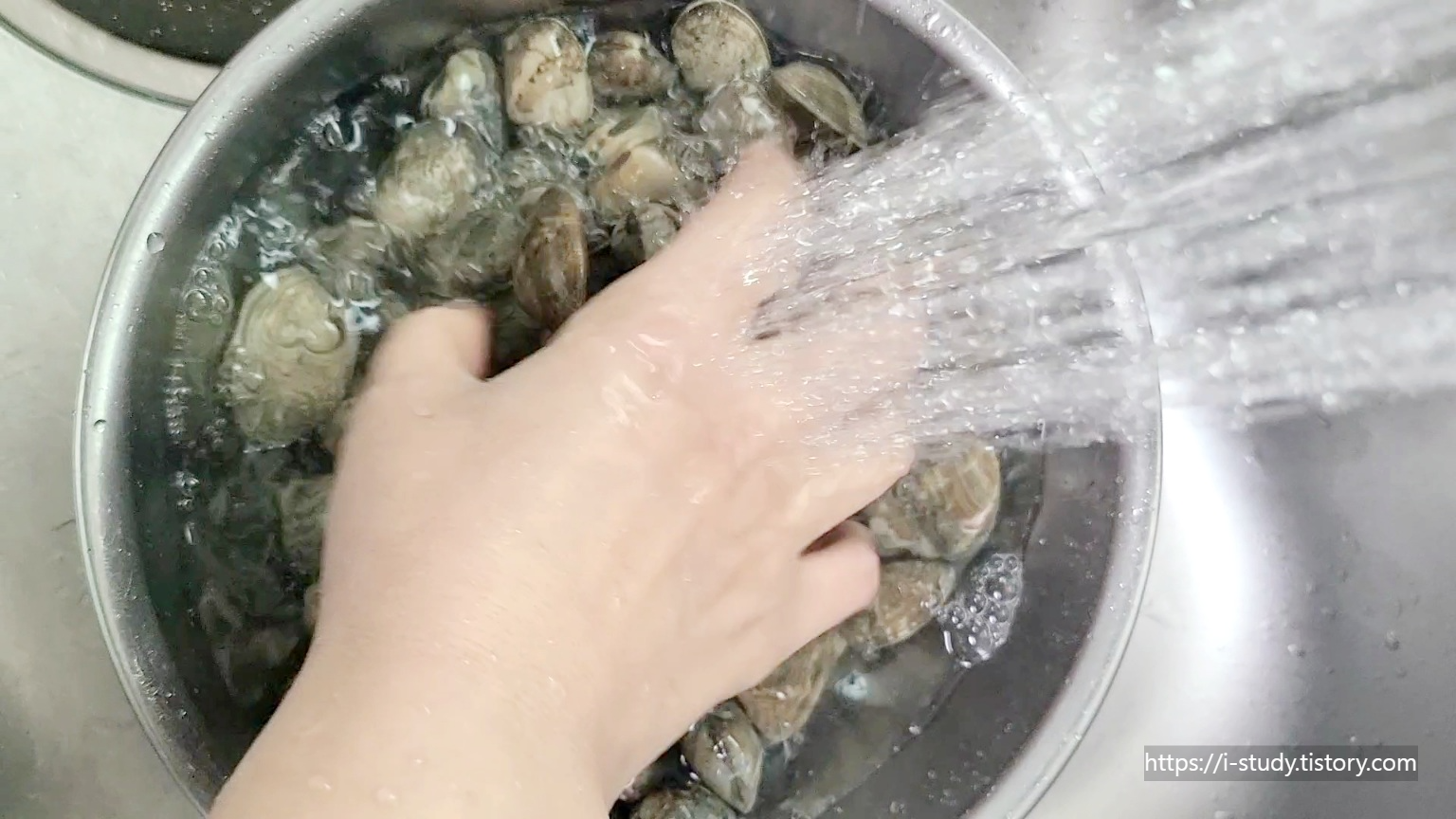 2. 해감한 조개를 씻어줍니다.