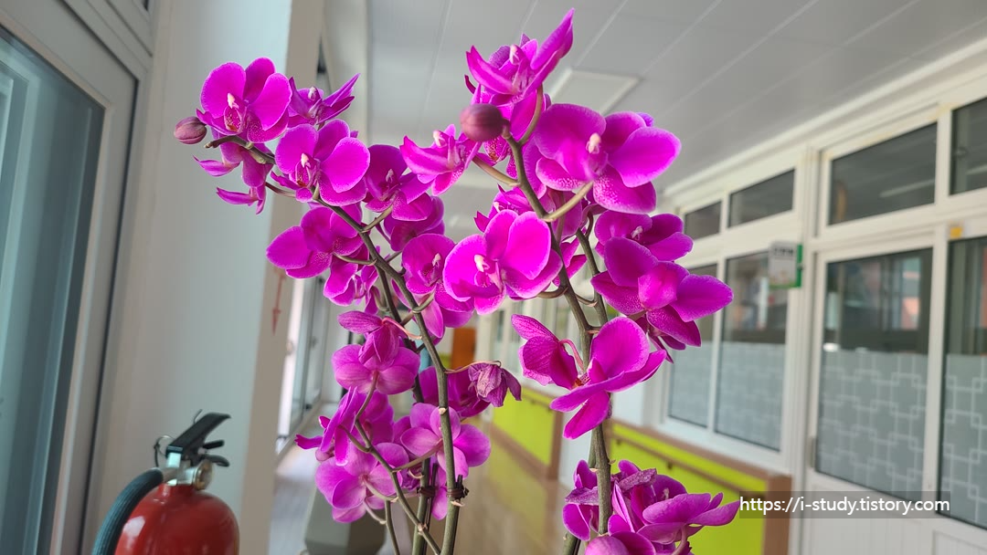 호접란은 간접광이 비치는 밝은 곳으로 동쪽으로 난 창 근처가 좋다고 합니다. 교실은 남향이지만 그래도 간접광이니 잘 키워보려고 합니다.
