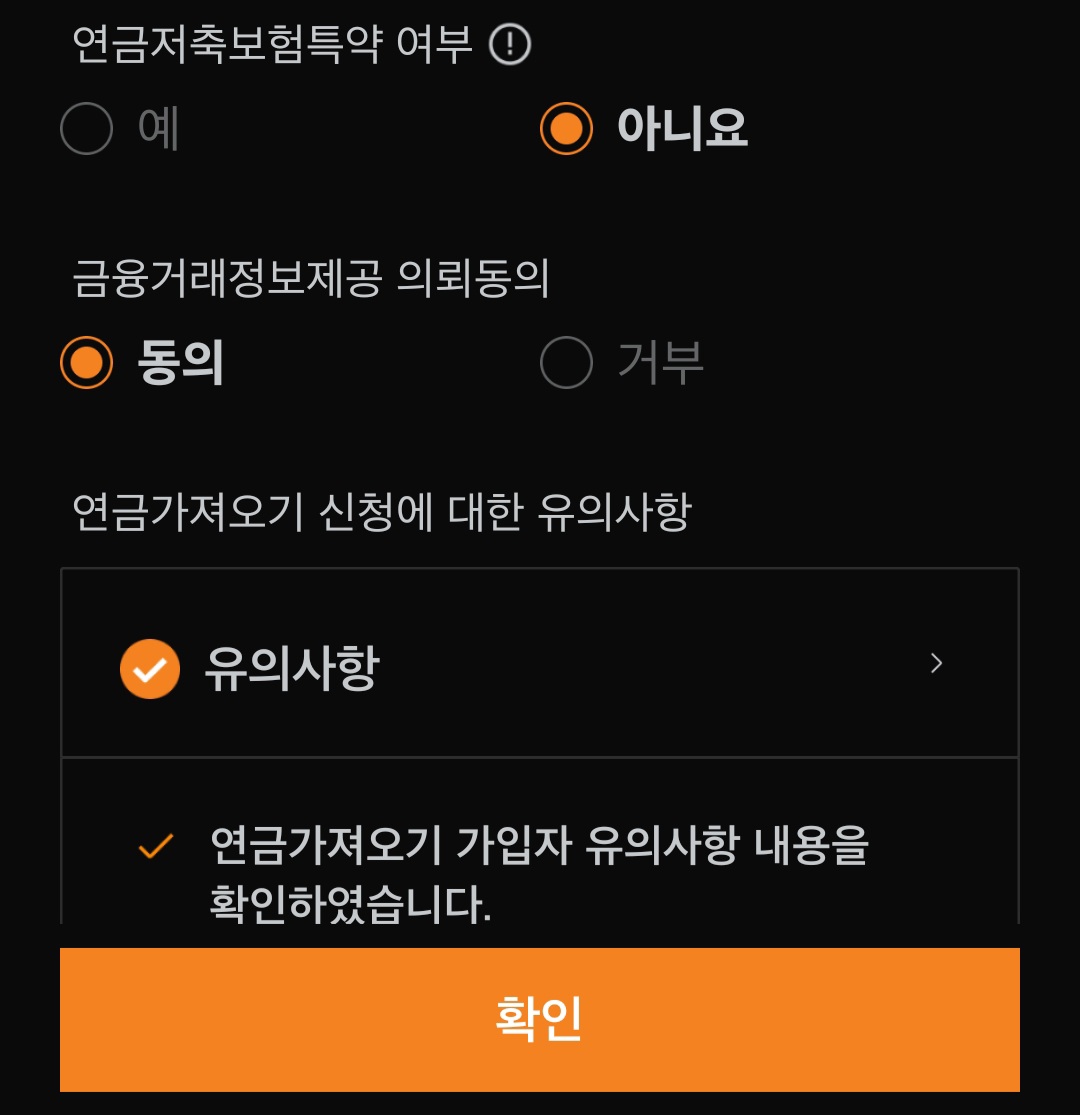 연금저축보험 특약 여부에는 '아니오', 금융거래정보제공 의뢰동의에는 '동의'를 선택합니다. 연금가져오기 가입자 유의사항 내용도 확인을 했습니다.