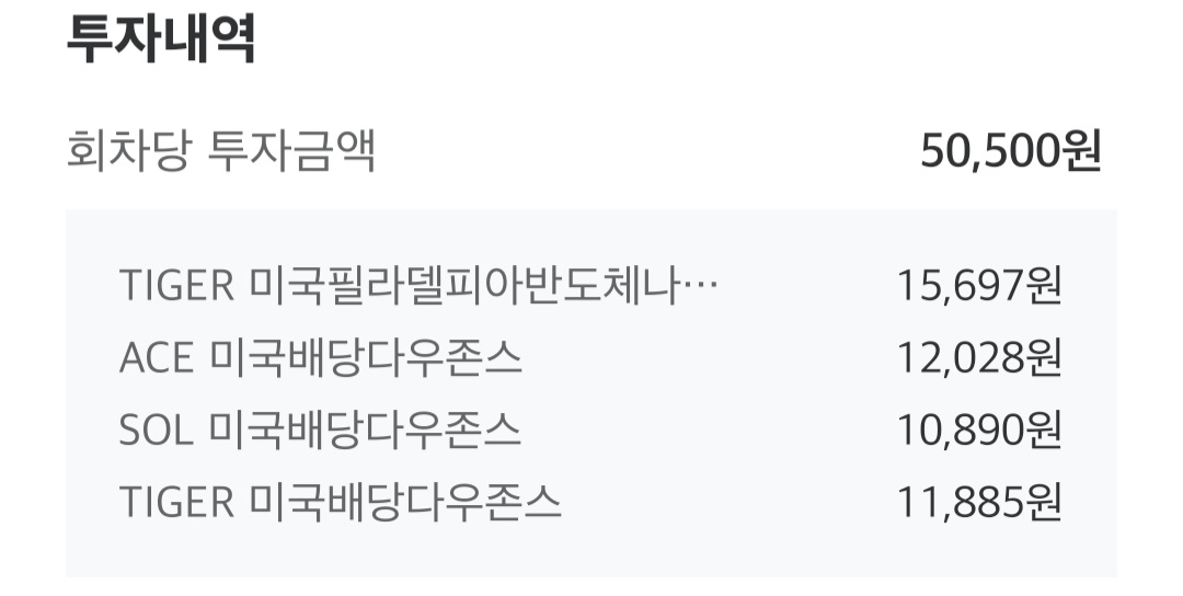 연금 적립식 장바구니로 TIGER 미국필라델피아반도체나스닥, ACE 미국배당다우존스, SOL 미국배당다우존스, TIGER 미국배당다우존스를 매일 주문하는 구조로 설정을 했습니다.