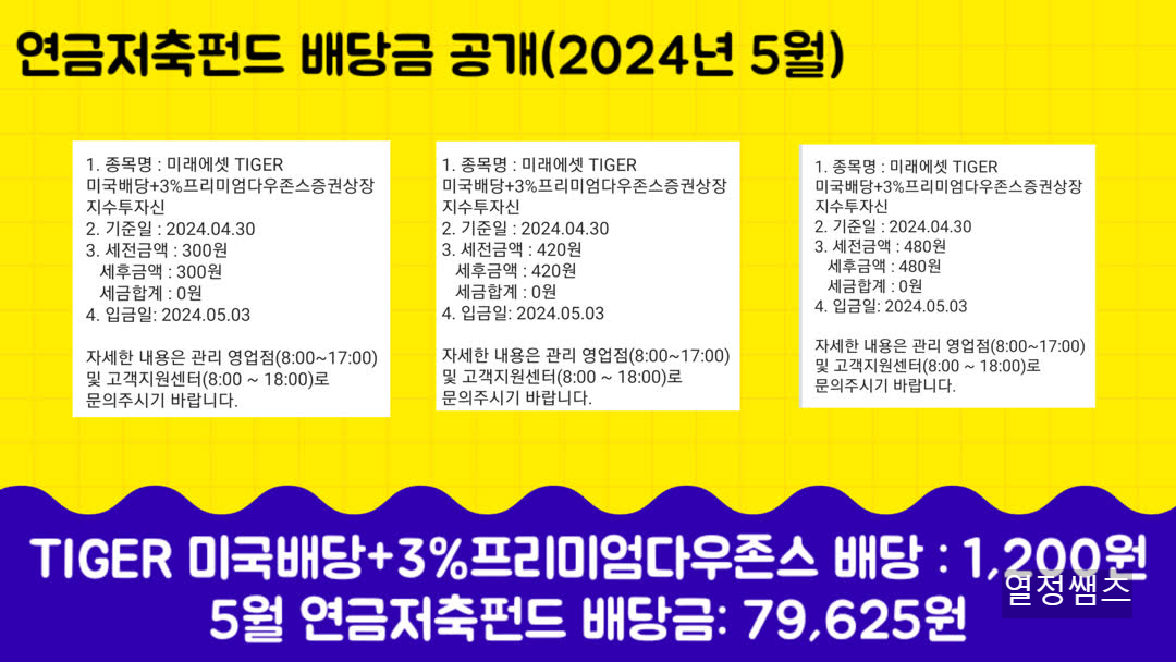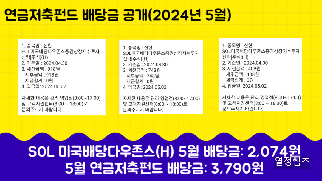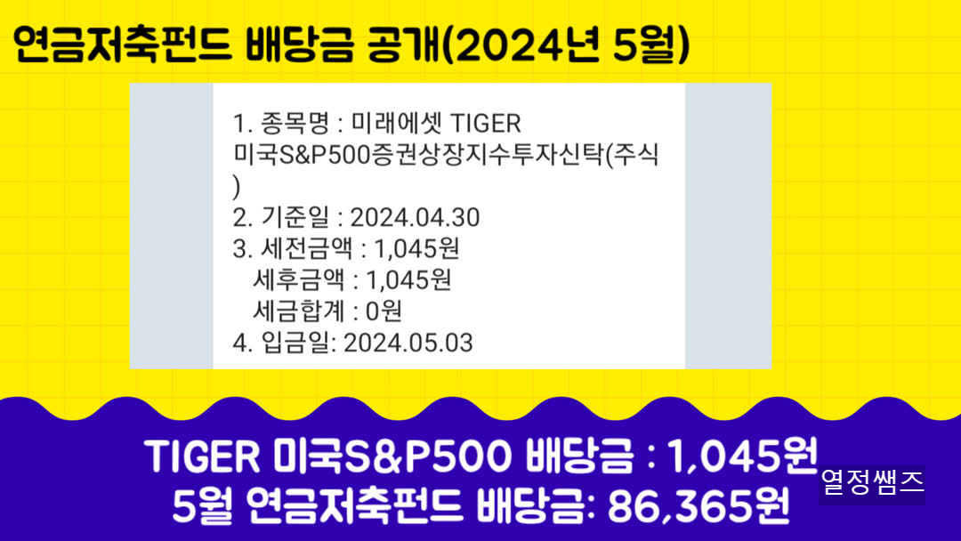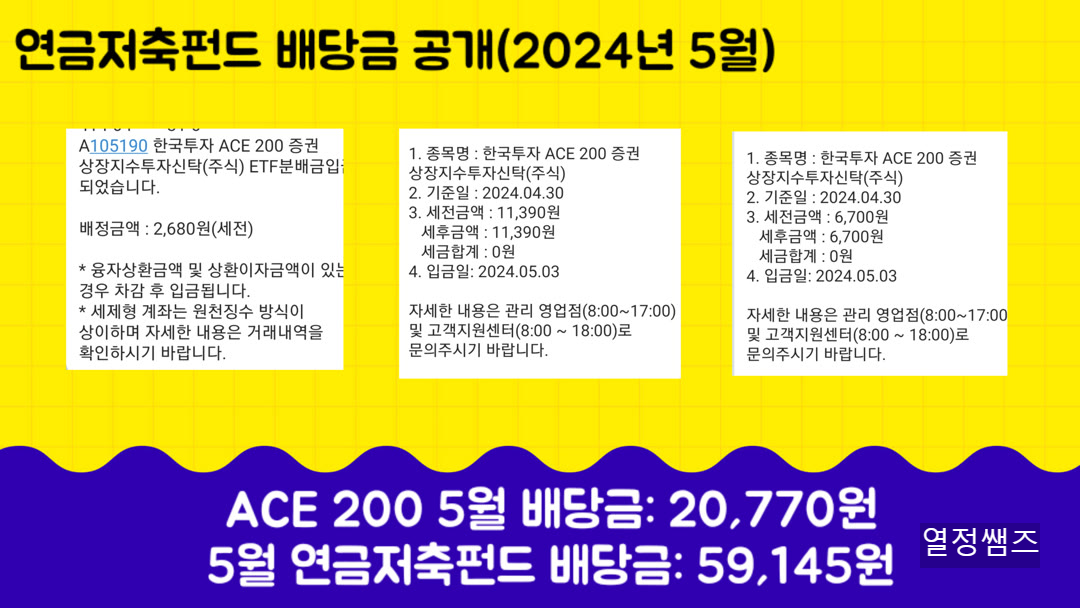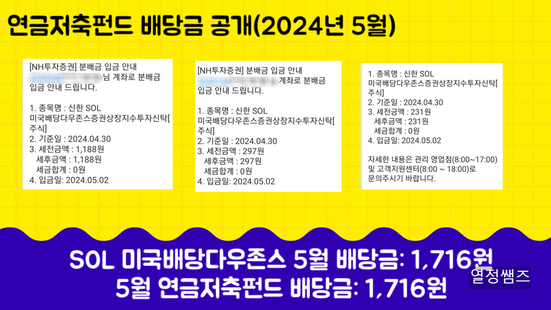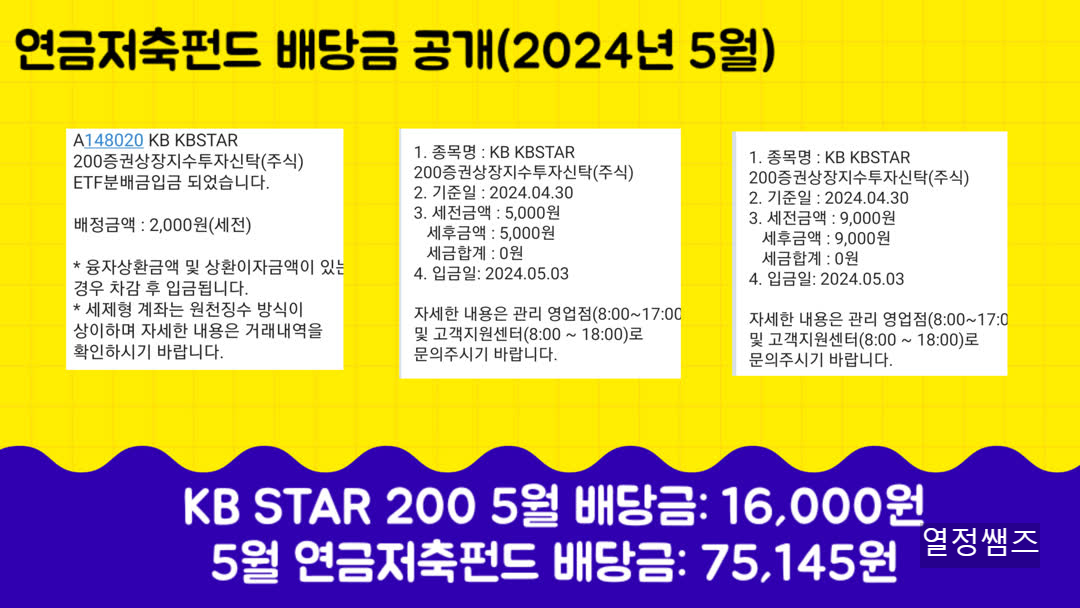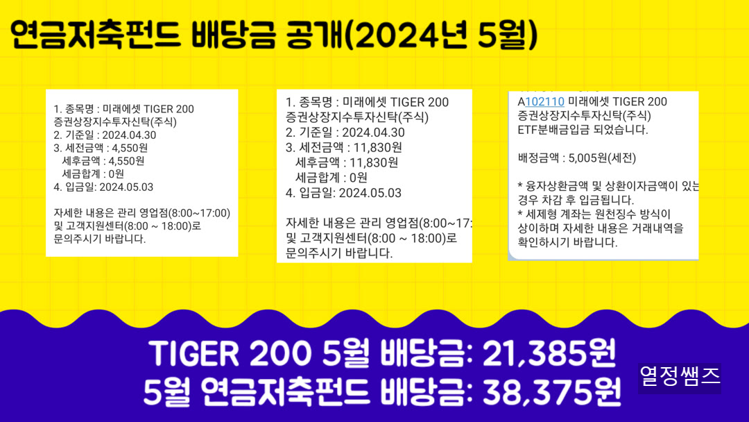 2024. 5월 연금저축펀드 etf 배당금 공개합니다. 10년 뒤에는 연금저축펀드 배당부자가 되어 있기를 꿈꿔봅니다.