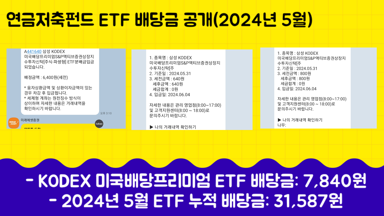 | 3달 ETF 월배당 26만원/ 2024. 6월 연금저축펀드 ETF 배당금 공개/ 티끌모아태산 (0) | 2024.07.07 |