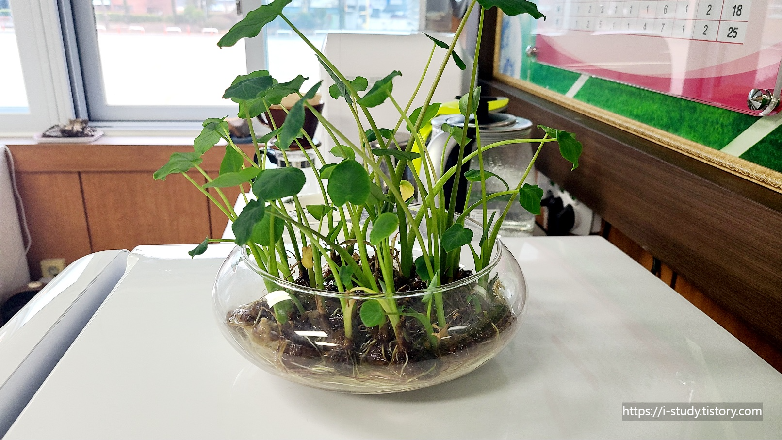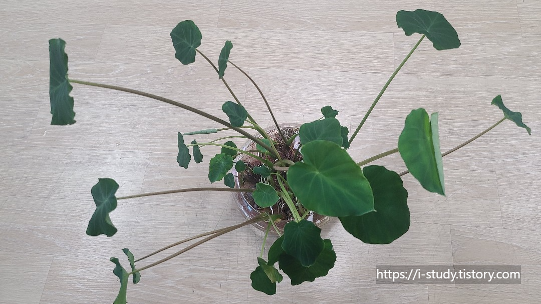TV에서 우산이 없을 때 쓰고 가던 장면이 기억이 났습니다. 이렇게 예쁘고 깔끔하게 수경재배로 관상용으로 토란을 키울 수 있구나.
