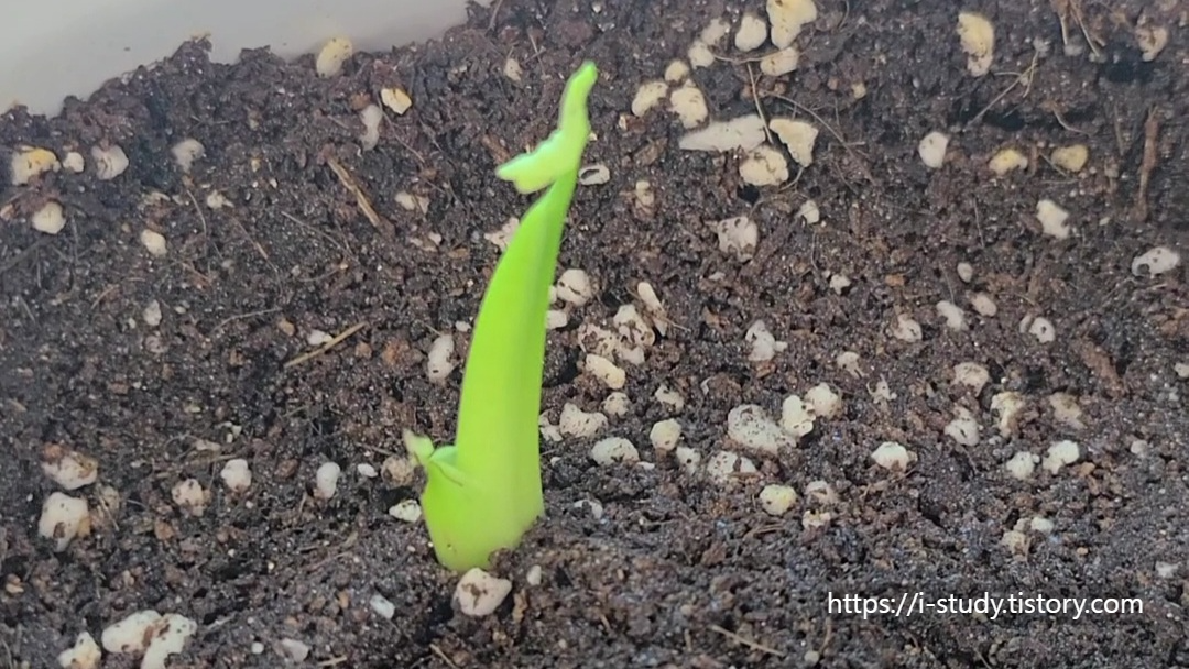 일주일이 지난 후 흙에 심은 토란에서 싹이 올라왔습니다. 흙을 뚫고 올라온 토란 새싹이 너무 예쁩니다.