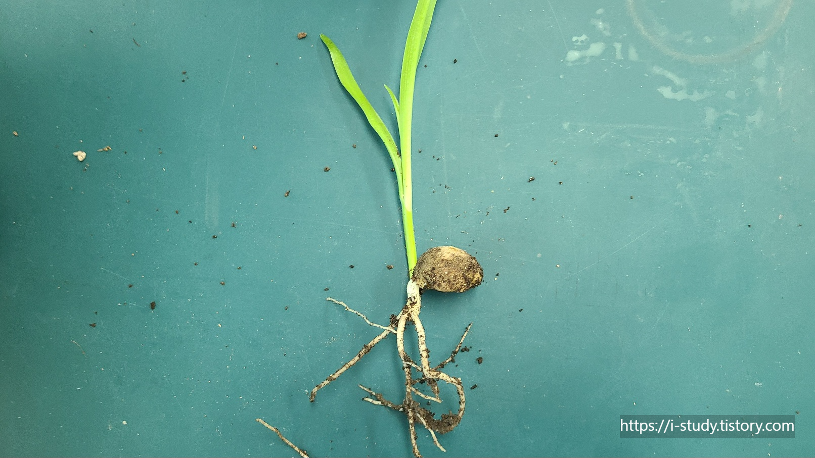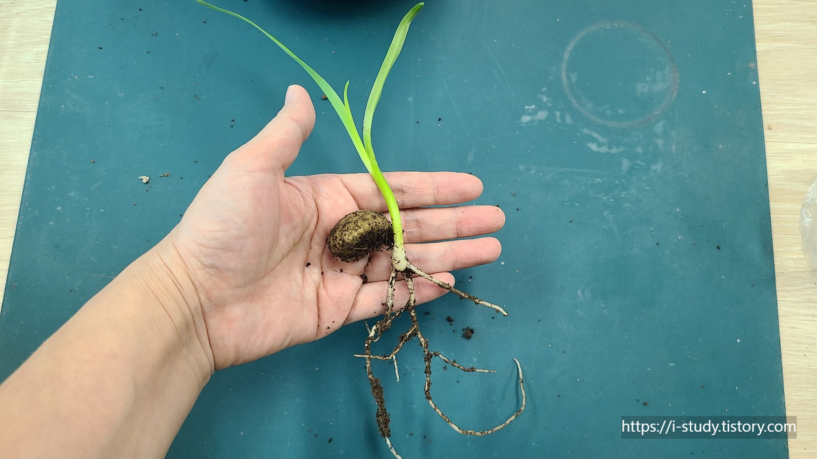 씨앗에서 잎과 줄기가 나와서 자라는 모습이 너무 신기합니다. 아직은 문주란 씨가 더 큽니다.