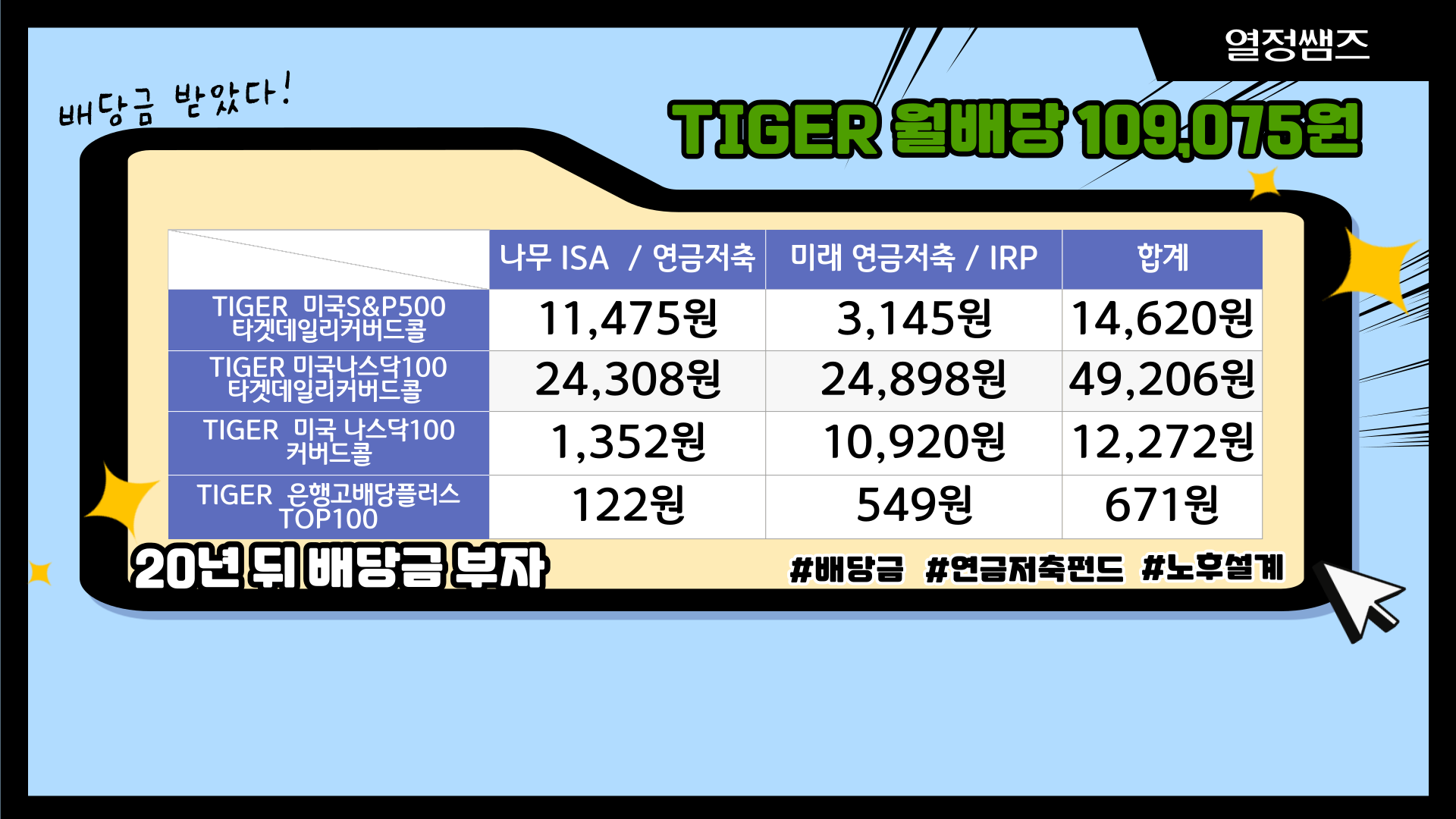 2024. 9월 중순 절세계좌 배당금6만원(ETF, 연금저축펀드, IRP, ISA) 정리입니다. 투자의 책임은 본인의 몫입니다. 기록용이기에 재미로 읽어주시기 바랍니다. https://youtu.be/amdgb9bA88A절세계좌 etf 배당