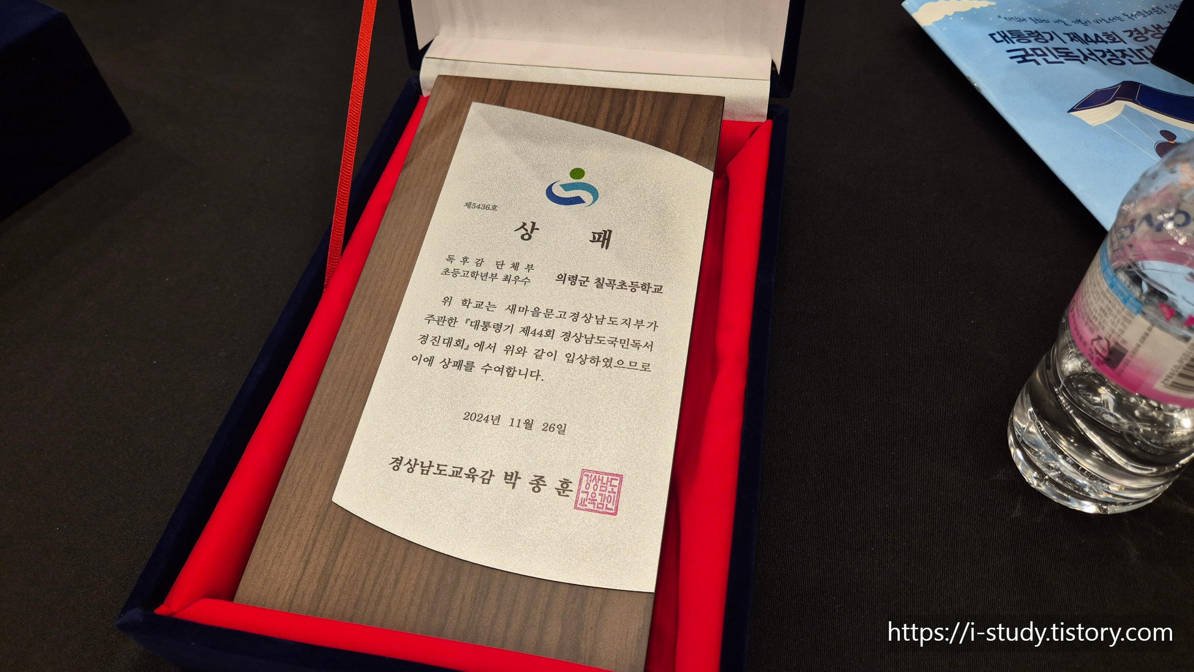 독후감 단체상 최우수를 받으면 상패를 줍니다. 단체상에 참여를 한 학생은 3명인데 상패는 하나만 줍니다. 그래서 이 상패는 학교에서 보관을 하려고 합니다.