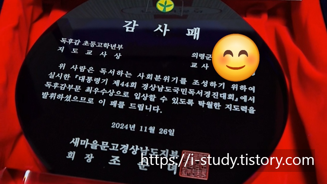 이 감사패는 처음입니다. 초등 고학년 독후감 단체부가 최우수를 받으면 지도교사가 감사패를 받을 수 있다는 사실을 처음 알게 되었습니다.