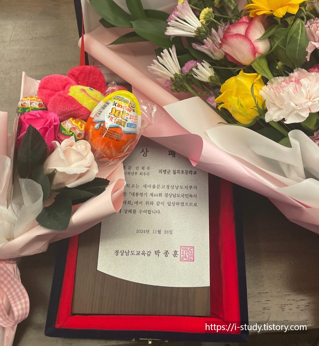 단체상을 받으러 대표로 갔던 6학년 윤** 학생이 상패를 가져가지 매우 아쉬워합니다. 교육감상이라서 최우수상 상품도 없습니다.