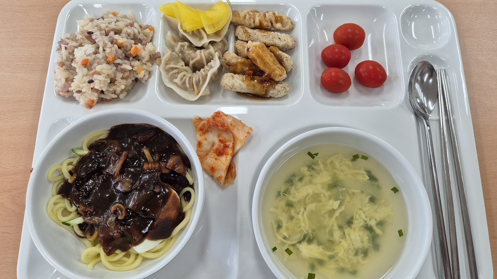 2일차 점심으로는 짜장면, 볶음밥, 만두, 탕수육, 방울토마토, 계란국이 나왔습니다. 아이들 입맛에 맞게 잘 나와서 마음에 듭니다. 맛있게 다 먹고 왔습니다.
