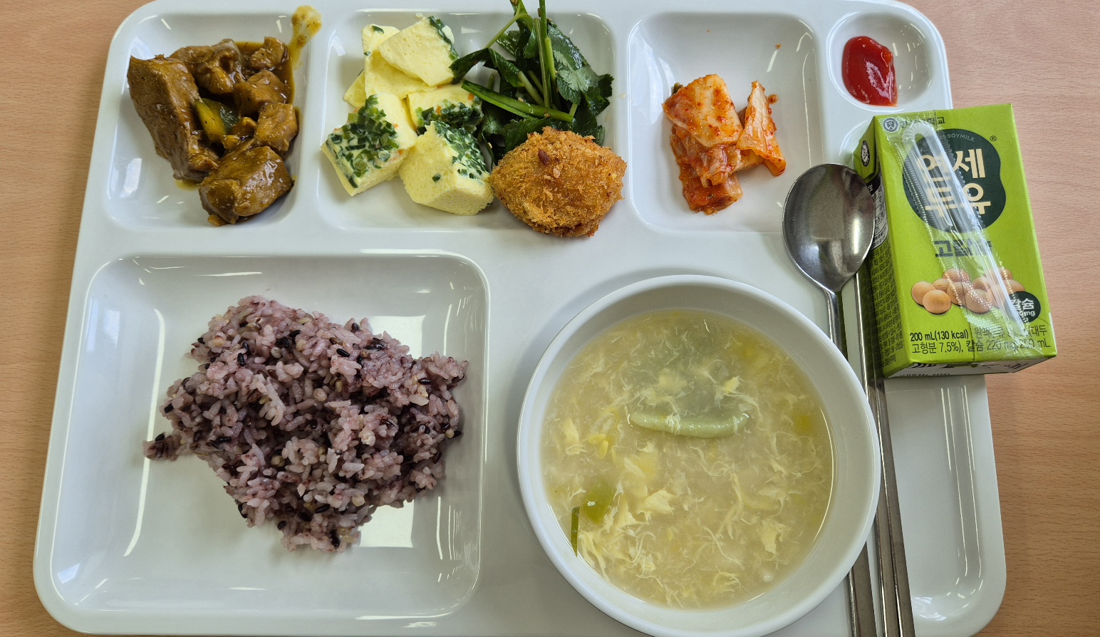 2일차 아침입니다. 수제비국, 연세두유, 고기반찬, 계란찜, 나물, 튀김이 나왔습니다. 아침인데도 두유를 빼고 다 먹었습니다. 우유 종류를 잘 소화시키지 못하다 보니 남깁니다.