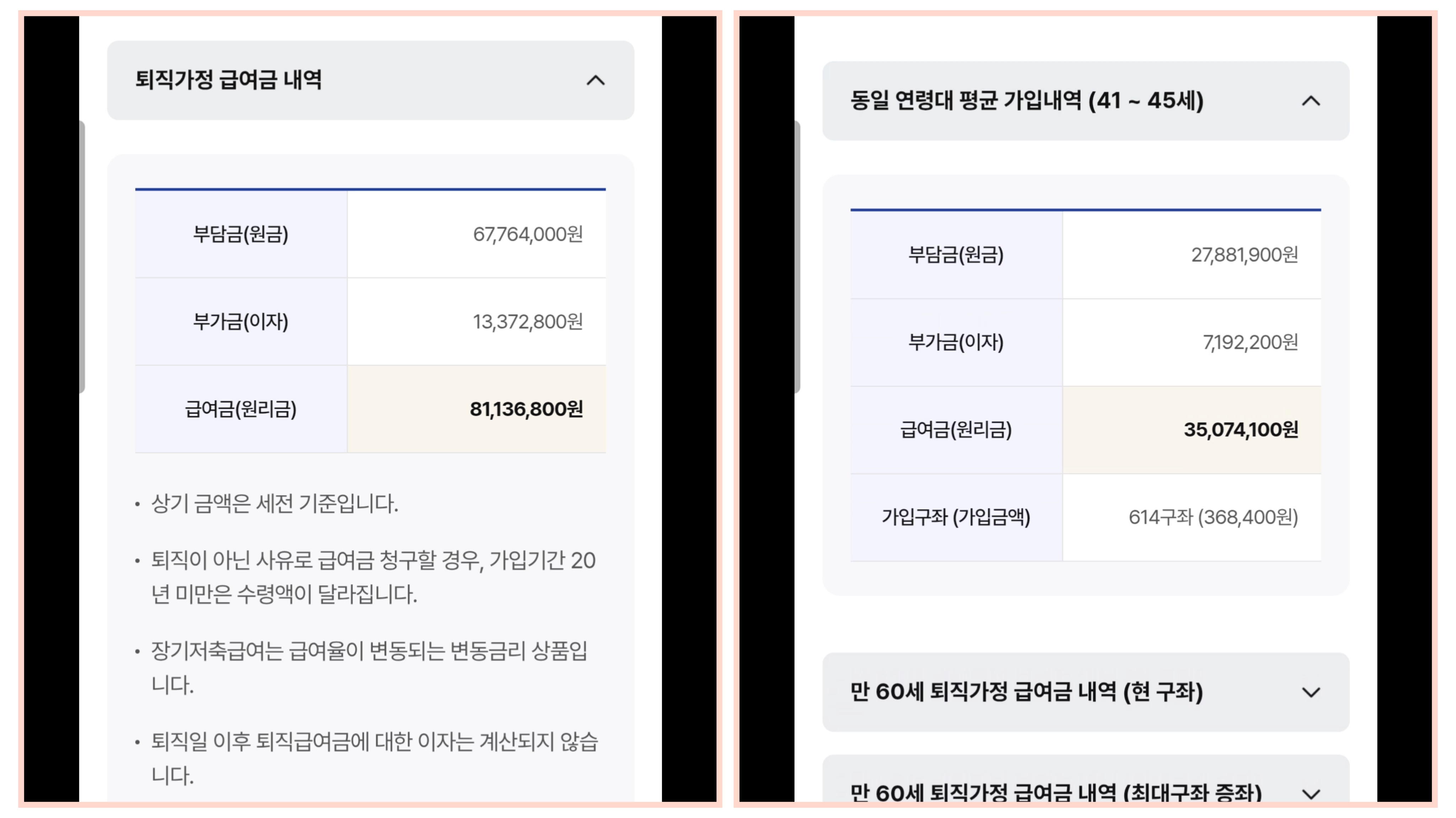 여태까지 넣은 원금은 6,776만원입니다. 이자는 1,337만원입니다. 퇴직가정 급여금은 8,113만원입니다.