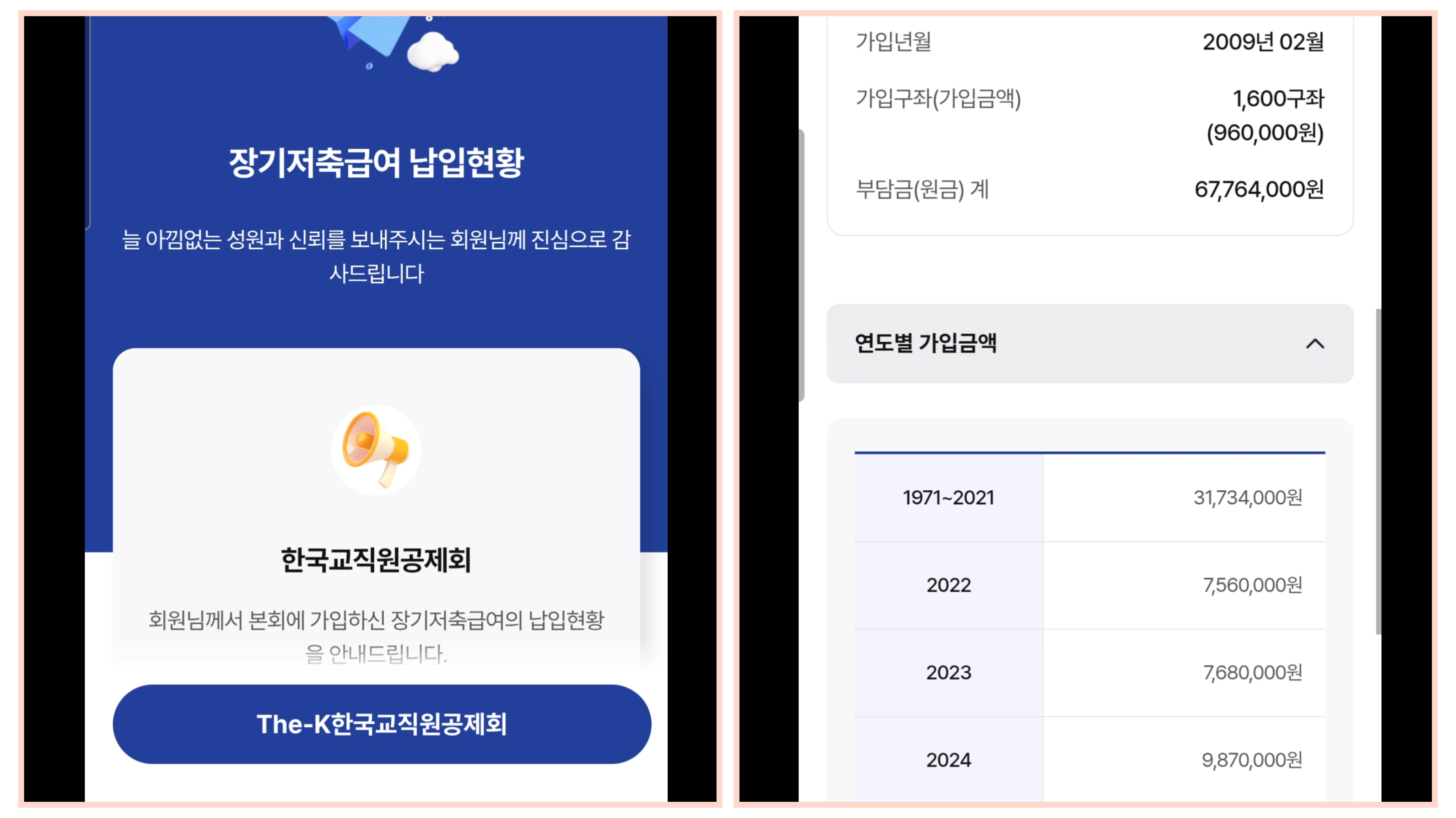 월급에서 빠지는 교직원공제회 장기저축급여금은 한 달에 90만원씩 180만원으로 1년에 2,160만원입니다.