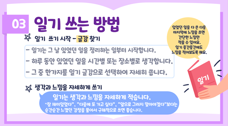 1. 일기는 생각과 느낌을 자세하게 적습니다.