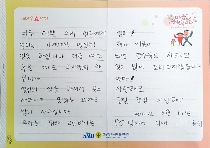 부모님께 편지 쓰기 예시작품(초등학교 저학년을 위한 자료)으로 세 편입니다. 두 편은 유튜브 동영상에 넣었습니다.